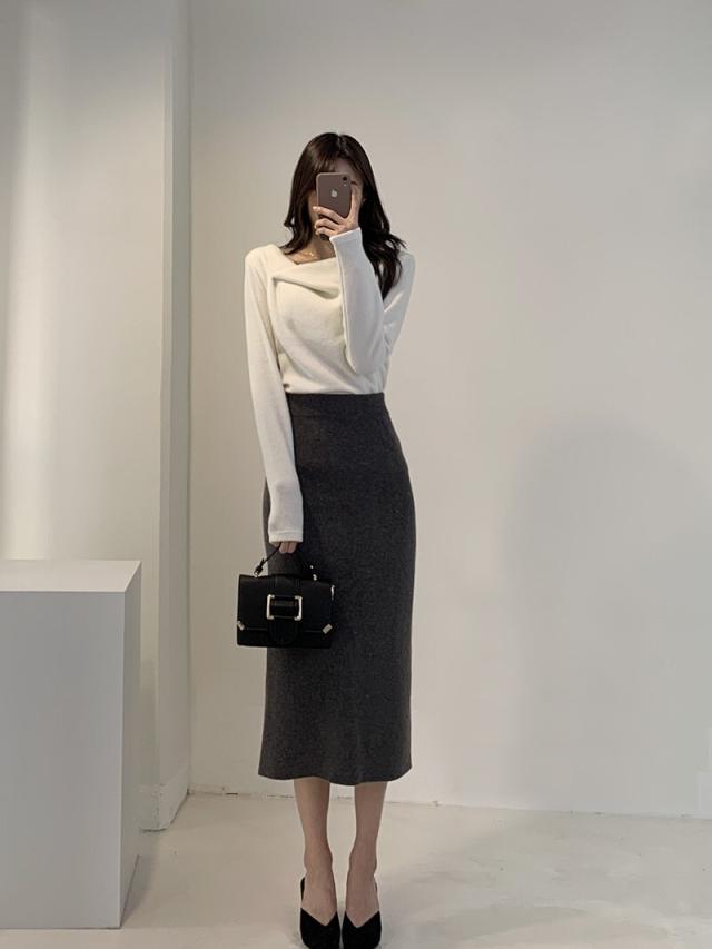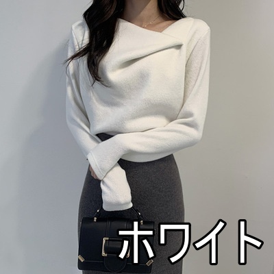 トップス ニットソー 3色 長袖 レディース ニット カットソー くすみカラー アシンメトリー 薄手 春 秋 冬 タイト スリム 細身 ホワイト 白 青 ブルー ベージュ グレー 無地 シンプル カジュアル きれいめ 上品 エレガント オシャレ お洒落 かわいい 大人可愛い 高級感