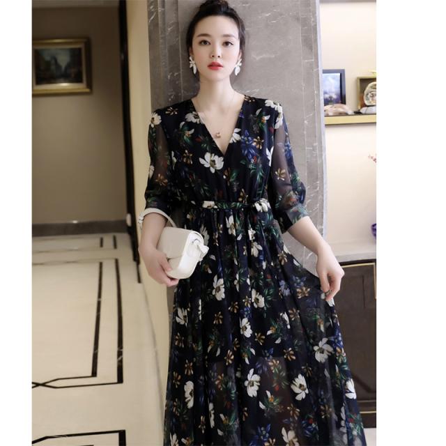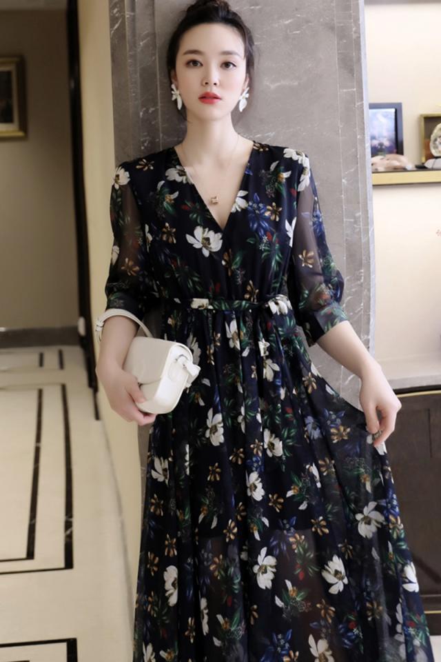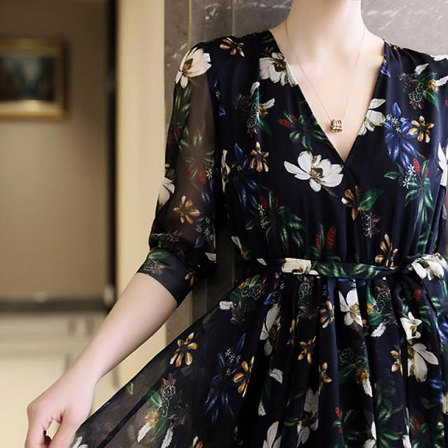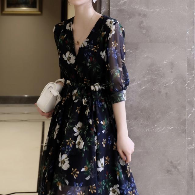 スカート ワンピース ドレス ロングスカート ロング ロング丈 5分袖 五分袖 7分袖 七分袖 Vネック シフォン リボン 薄手 大人可愛い おしゃれ お洒落 ラブリー キュート ガーリー ルーズ 個性的 花柄 春 秋 20代 30代 レディース 女性用 デート お出かけ 女子会 休日