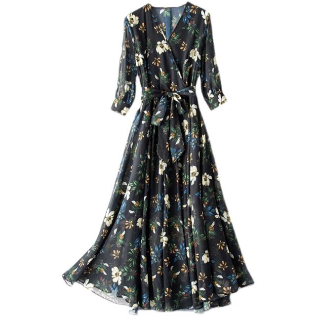スカート ワンピース ドレス ロングスカート ロング ロング丈 5分袖 五分袖 7分袖 七分袖 Vネック シフォン リボン 薄手 大人可愛い おしゃれ お洒落 ラブリー キュート ガーリー ルーズ 個性的 花柄 春 秋 20代 30代 レディース 女性用 デート お出かけ 女子会 休日 パーティー イベント リゾート 旅行 ホテル ガーデン レストラン 普段使い ファッション コーデ スタイル 楽ちん モテ M L XL 2XL 3XL 4XL 5XL 黒 ブラック