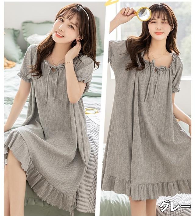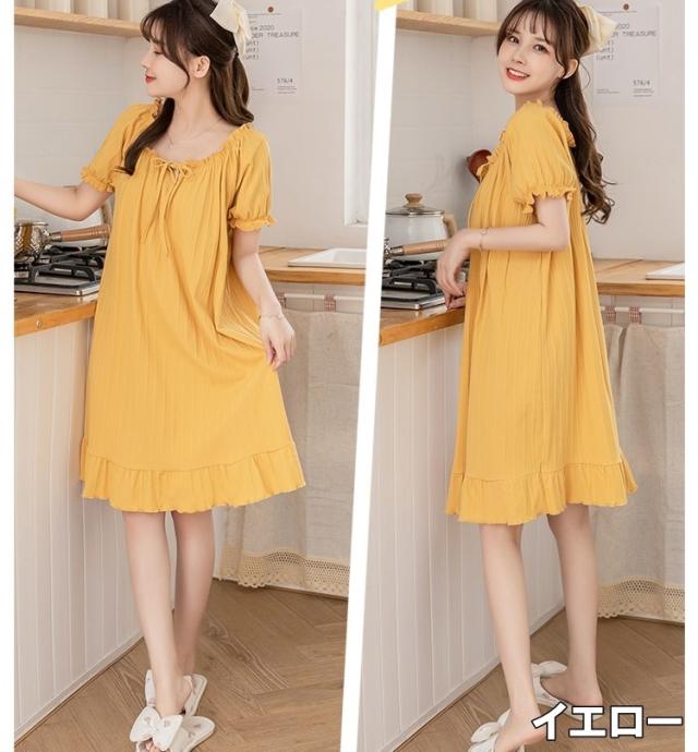 ルームウェア レディース ナイトドレス ネグリジェ パジャマドレス パジャマ ワンピース M L XL 2XL グレー 灰色 イエロー 黄色 ベージュ 大人カラー くすみカラー 春 夏 半袖 パフスリーブ Vネック フリル リボン ギャザー 無地 部屋着 リラックス ミドル丈 ミドル 膝丈