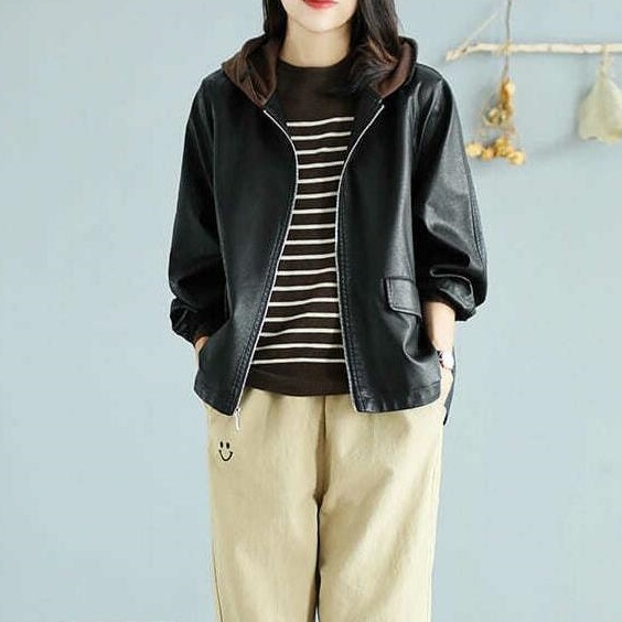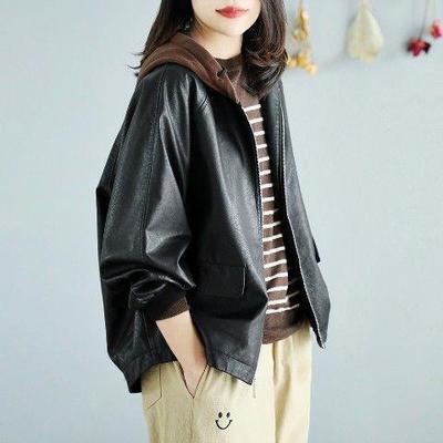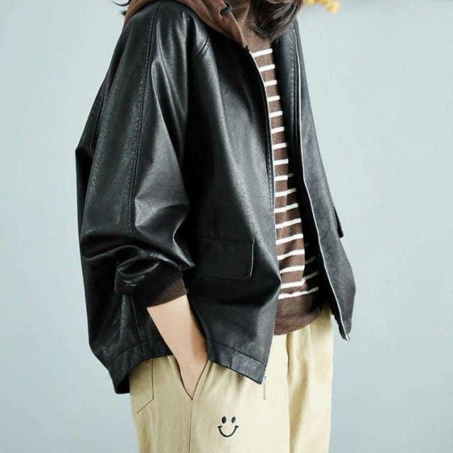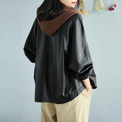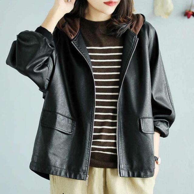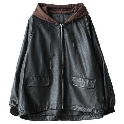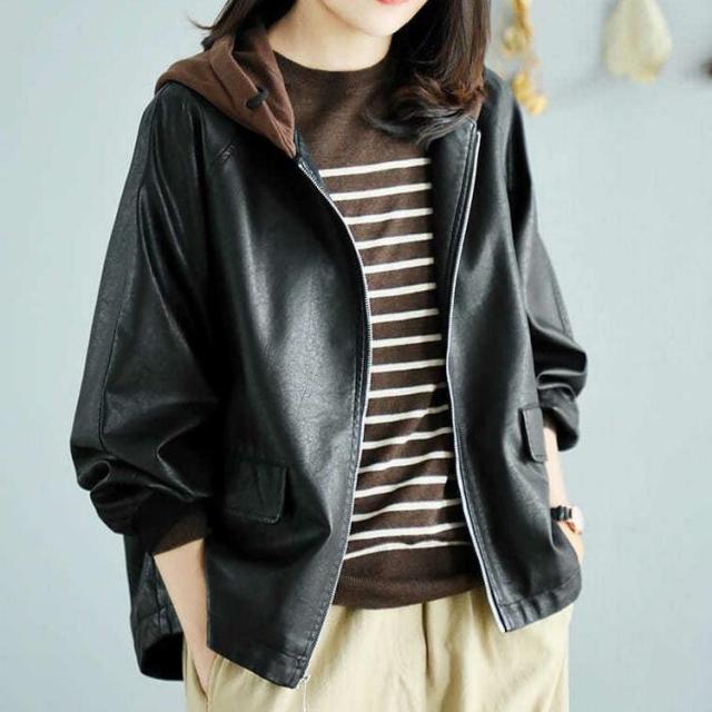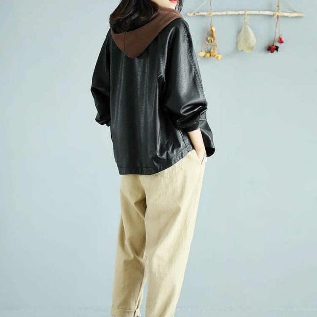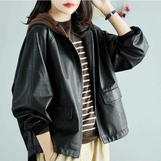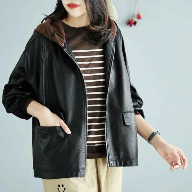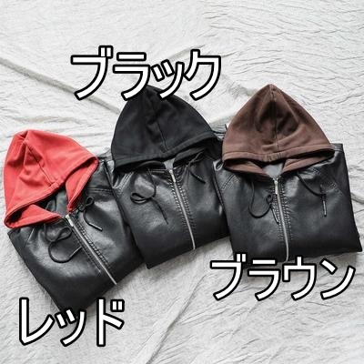 アウター ジャケット フード付き 3色 レディース レザー フェイクレザー ライダース 異素材 ドッキング 大きいサイズ 大きめ ゆったり L XL 体型カバー 着痩せ クール かっこいい ボーイッシュ レザージャケット 秋 冬 春 黒 ブラック 赤 レッド ブラウン 茶色 お洒落 オシャレ ファスナー ポケット カジュアル ラフ 20代 30代 40代 こなれ感 メンズライク ルーズ 無地 普段着 お出かけ 防寒 重ね着