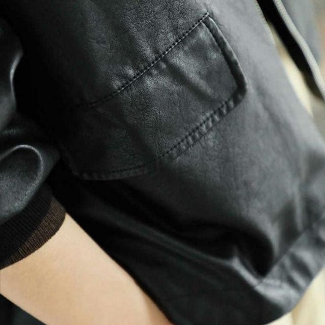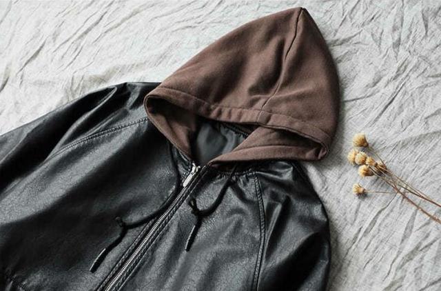 異なる素材のフードが付いたレザージャケットです。