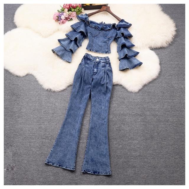 上下セット 2点セット ツーピース トップス ボトムス パンツ セットアップ カットソー 袖あり 長袖 ボリューム袖 オフショルダー ルーズ スリム タイト 細身 デニム ブルーデニム カラーデニム かわいい カジュアル おしゃれ お洒落 かっこいい こなれ感 スポーティー 個性的
