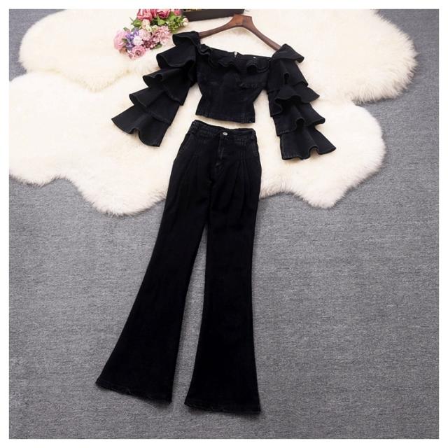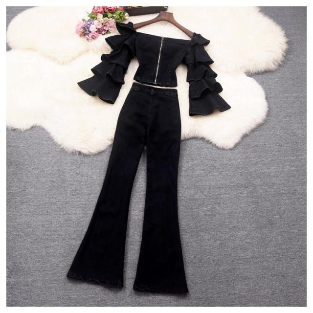 上下セット 2点セット ツーピース トップス ボトムス パンツ セットアップ カットソー 袖あり 長袖 ボリューム袖 オフショルダー ルーズ スリム タイト 細身 デニム ブルーデニム カラーデニム かわいい カジュアル おしゃれ お洒落 かっこいい こなれ感 スポーティー 個性的 モード系 存在感 無地 レディース 着回し 韓国 オルチャン 美脚 脚長 S M L 黒 ブラック 青 ブルー