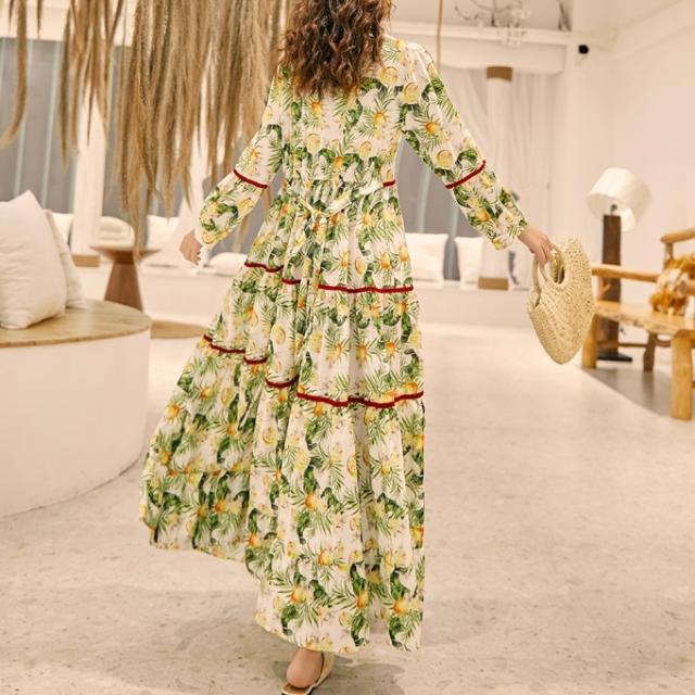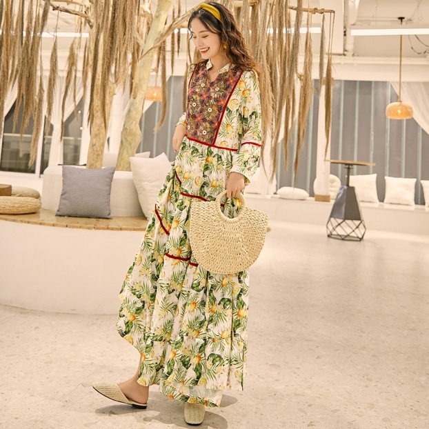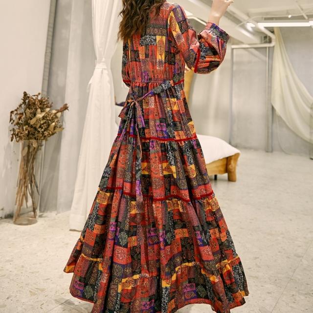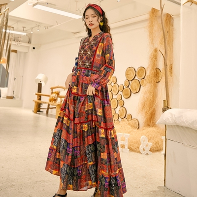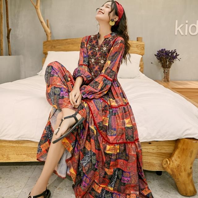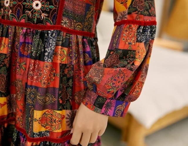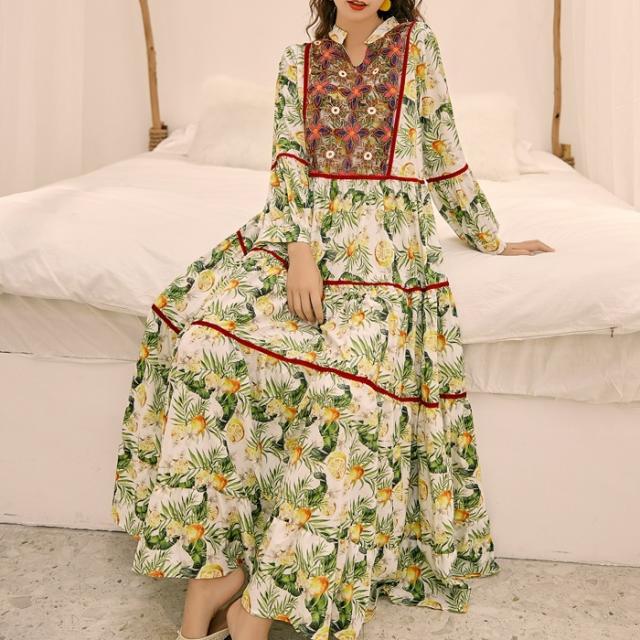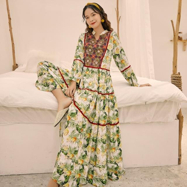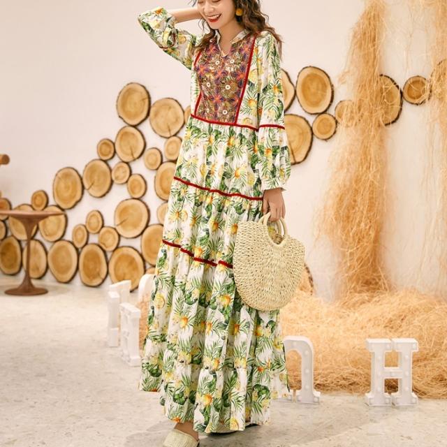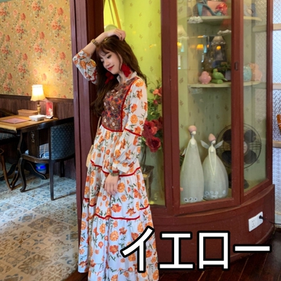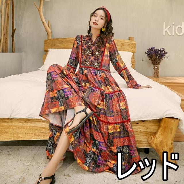 ワンピース ロング丈 長袖 ボヘミアン 4色 レディース エスニック レトロ アジアン エキゾチック リゾート ゆったり 大きめ 大きいサイズ ワイド S М L XL 刺繍 Aライン 花柄 フラワー レモン 小花 マキシワンピース ロングワンピ ランタンスリーブ 赤 レッド 黄色 イエロー