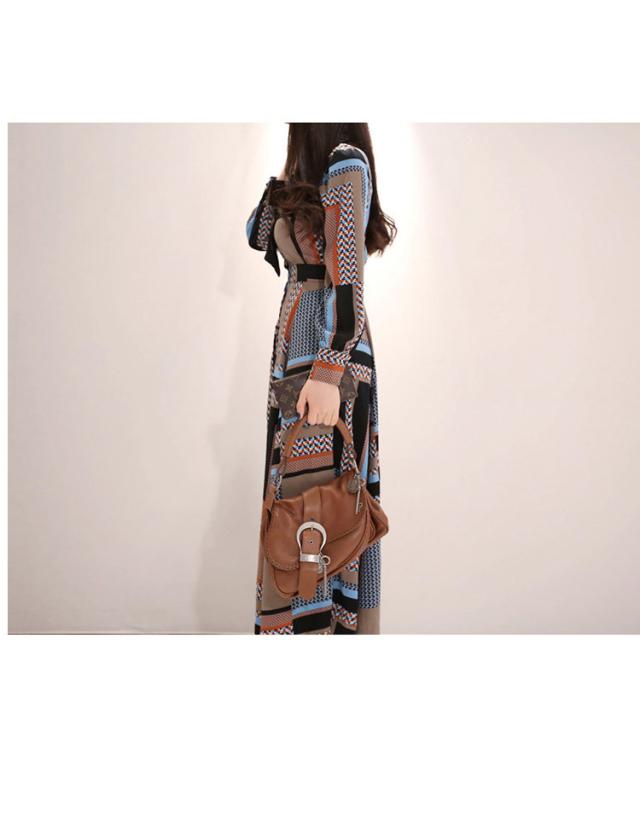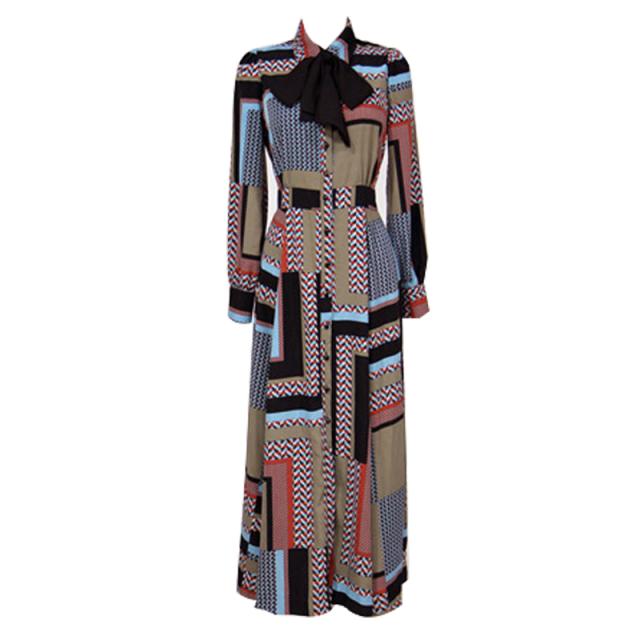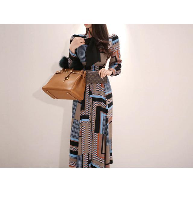 シックなブラウンカラーの幾何学柄ボウタイリボンロングワンピース。