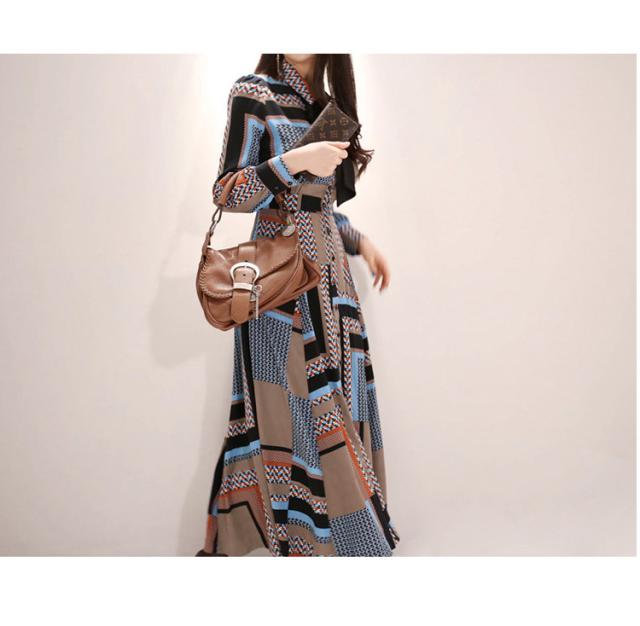 ワンピース ロングワンピース フレアワンピース ロング丈 袖あり 長袖 パフスリーブ 襟付き ボウタイ Aライン ウエストベルト ウエストマーク 大人可愛い きれいめ 大人 上品 おしゃれ お洒落 かっこいい レトロ 大人女子 こなれ感 個性的 クール モード系 エレガント モダン 主役級 存在感 とろみ感 抜け感 S M L XL ブラウン 茶色 幾何学模様 柄 くすみカラー 大人カラー 春 秋 20代 30代 40代 50代 ママ オフィス ビジネス OL 通勤 デート お出かけ 女子会