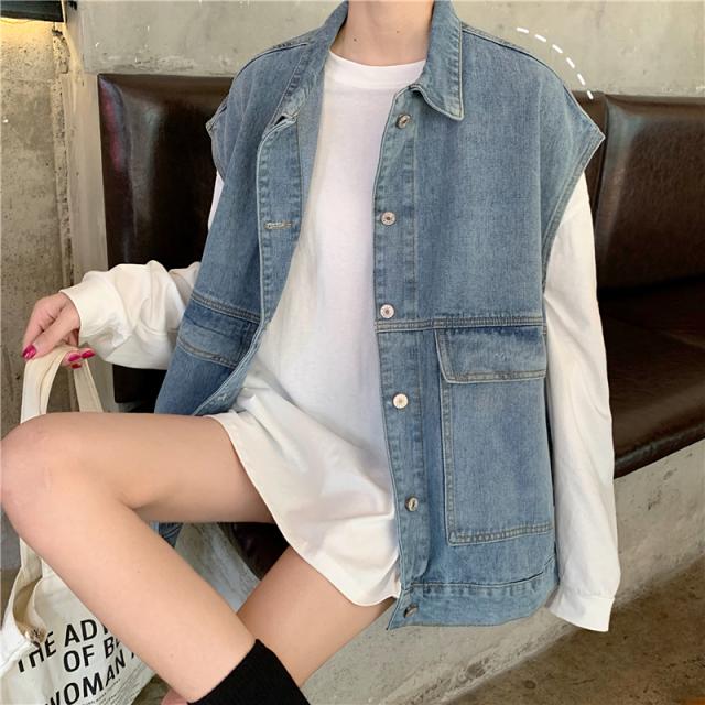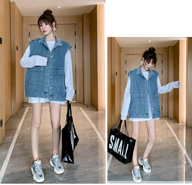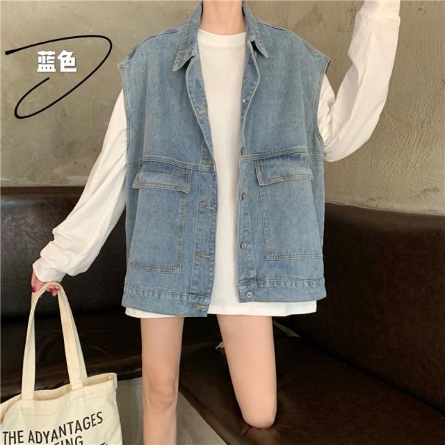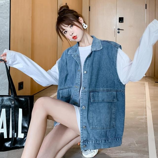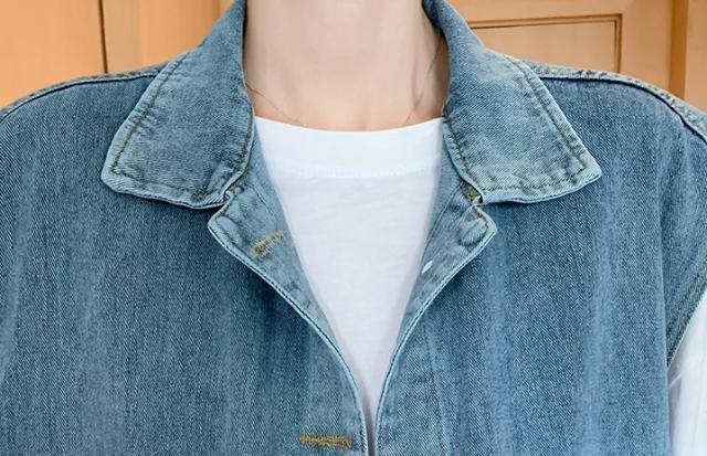 デニム ベスト ジャケット レディース 襟付き オーバーサイズ ノースリーブ プラスサイズ オシャレ お洒落 Iライン ストレート かわいい 大人可愛い 20代 30代 40代 着回し 重ね着 シンプル カジュアル ラフ ジレ チョッキ 無地 ブルー 青 ブリーチ 色落ち 体型カバー 着痩せ