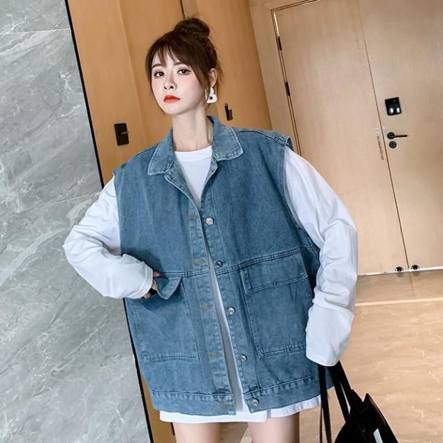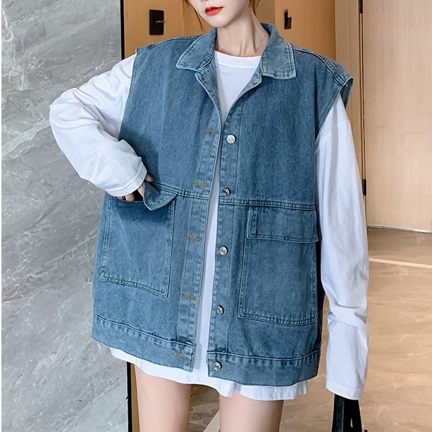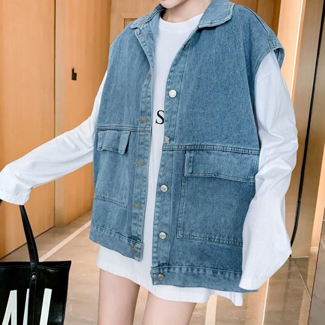 デニム ベスト ジャケット レディース 襟付き オーバーサイズ ノースリーブ プラスサイズ オシャレ お洒落 Iライン ストレート かわいい 大人可愛い 20代 30代 40代 着回し 重ね着 シンプル カジュアル ラフ ジレ チョッキ 無地 ブルー 青 ブリーチ 色落ち 体型カバー 着痩せ 細見え ゆったり 大きめ М L XL 2XL 3XL 4XL 大きいサイズ 春 秋 冬 抜け感 ルーズ こなれ感 休日 ショッピング 公園 買い物 前開き ポケット クール かっこいい ボーイッシュ ストリート