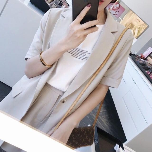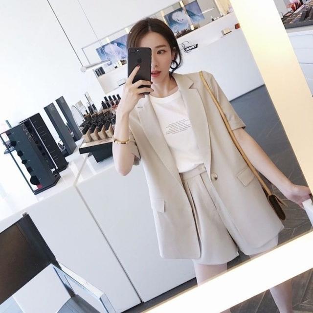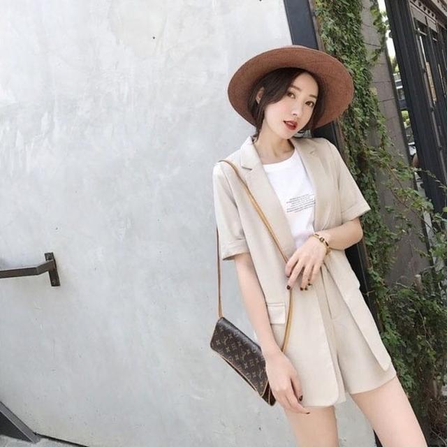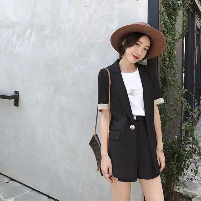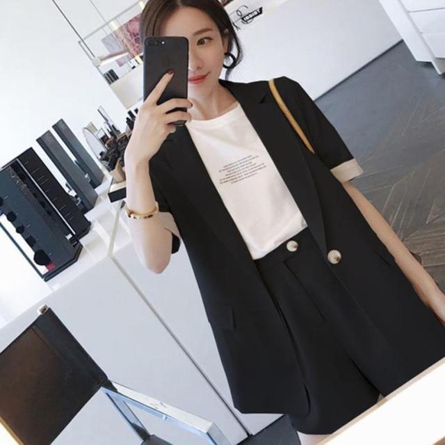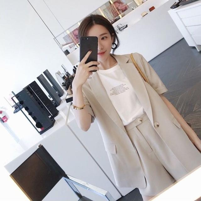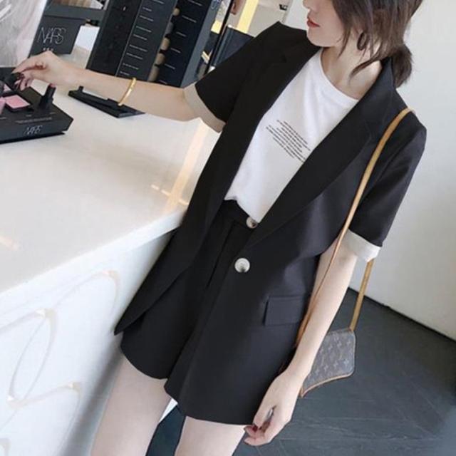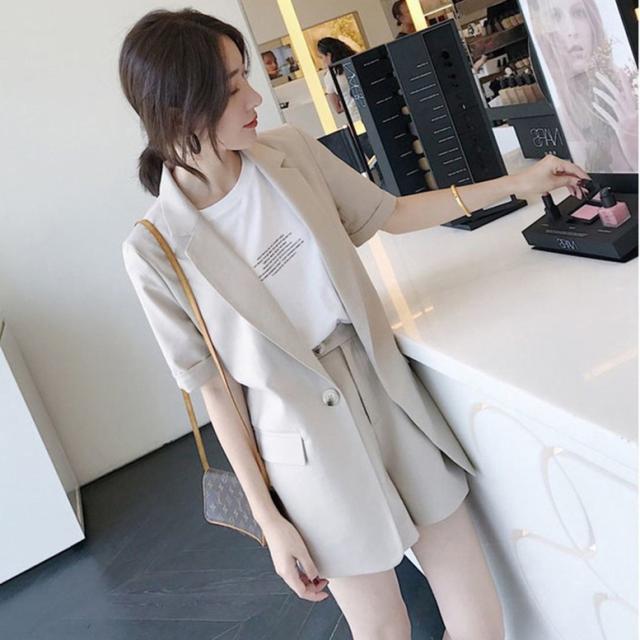 ハーフパンツスーツセット セットアップ レディース ジャケット・ショートパンツ2点セット オフィスカジュアル スーツジャケット 半袖 上下セット スーツ パンツセット ロングテーラードジャケット パンツスーツ ショートパンツ ハーフパンツ 事務 黒 ブラック ベージュ