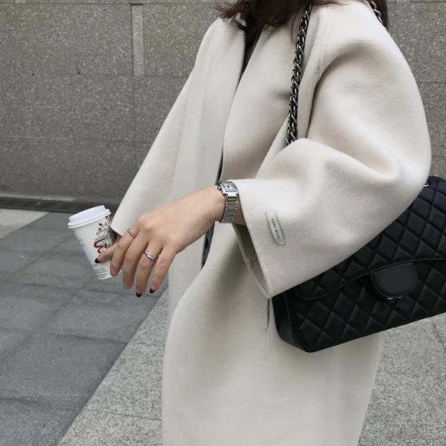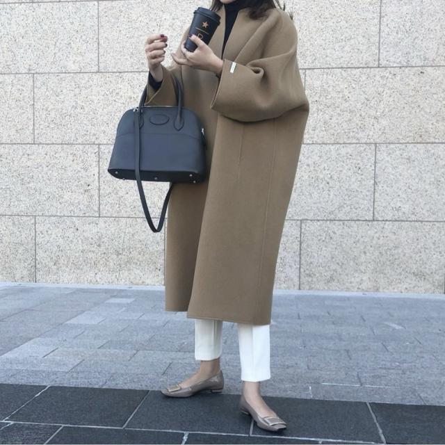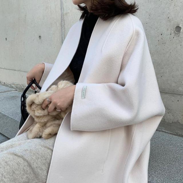 縦ラインを意識したフロントのディテールがポイントのコートはすとんとしたコクーンシルエットがこなれ感を演出