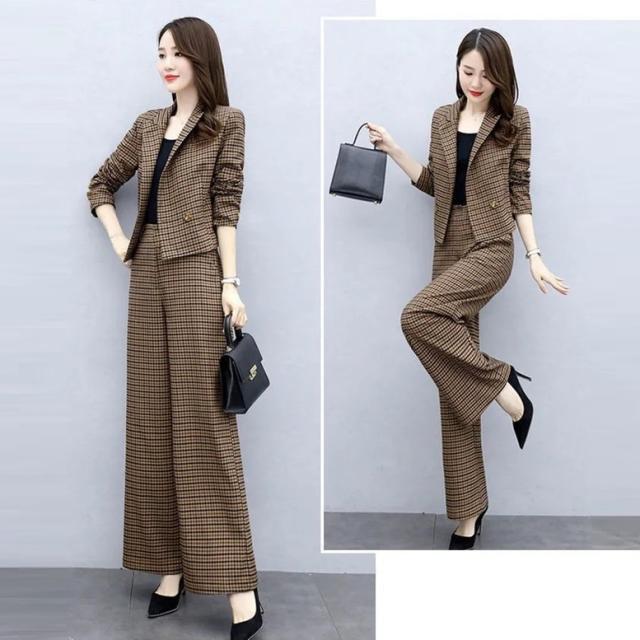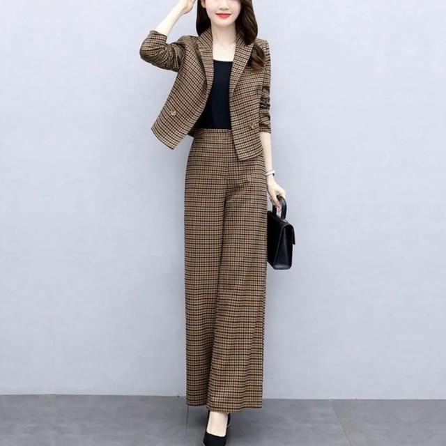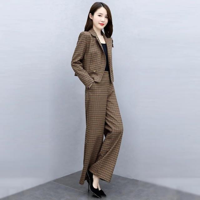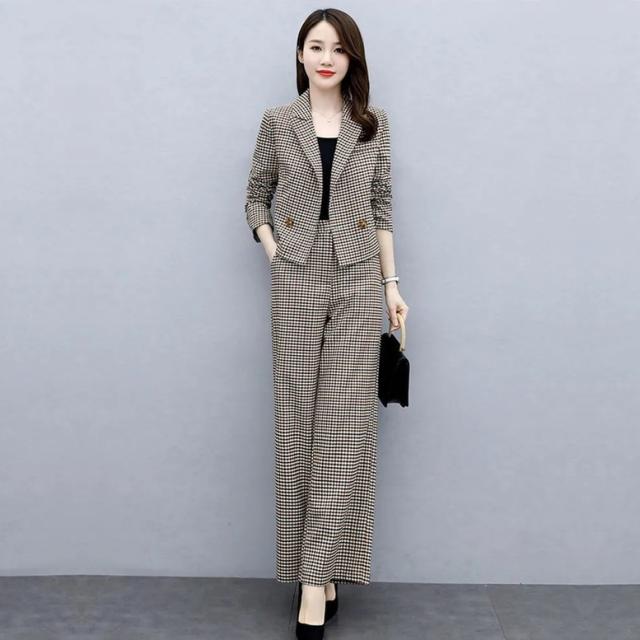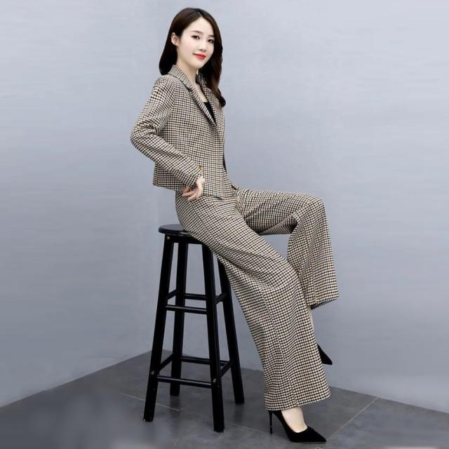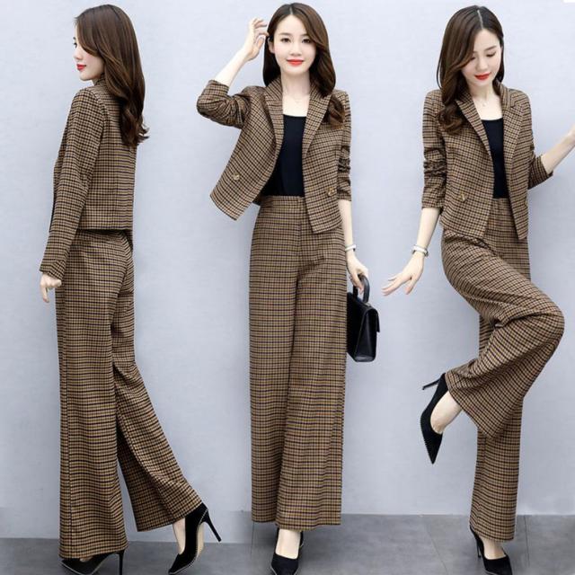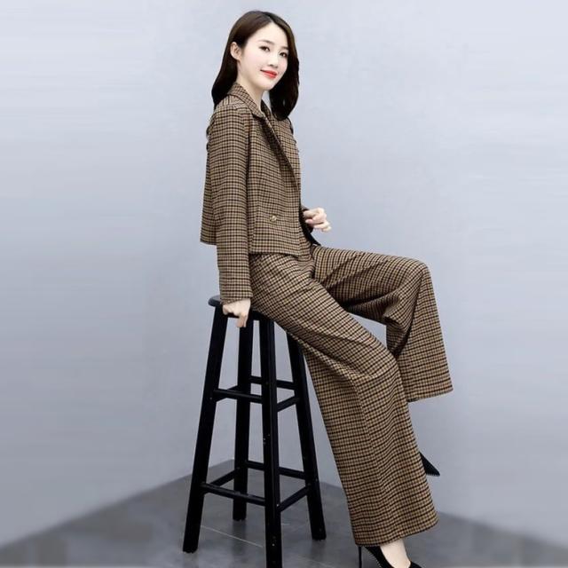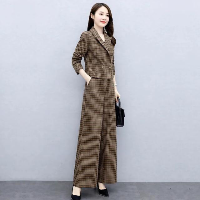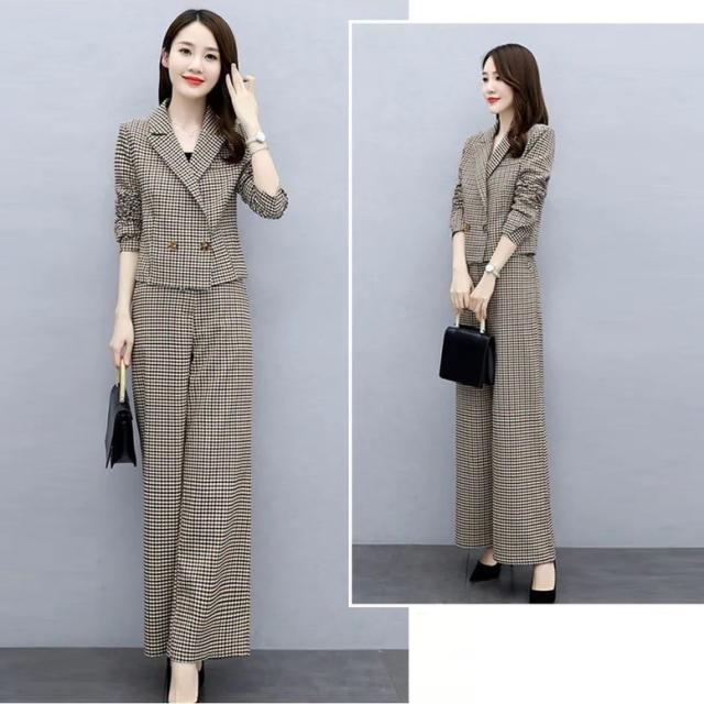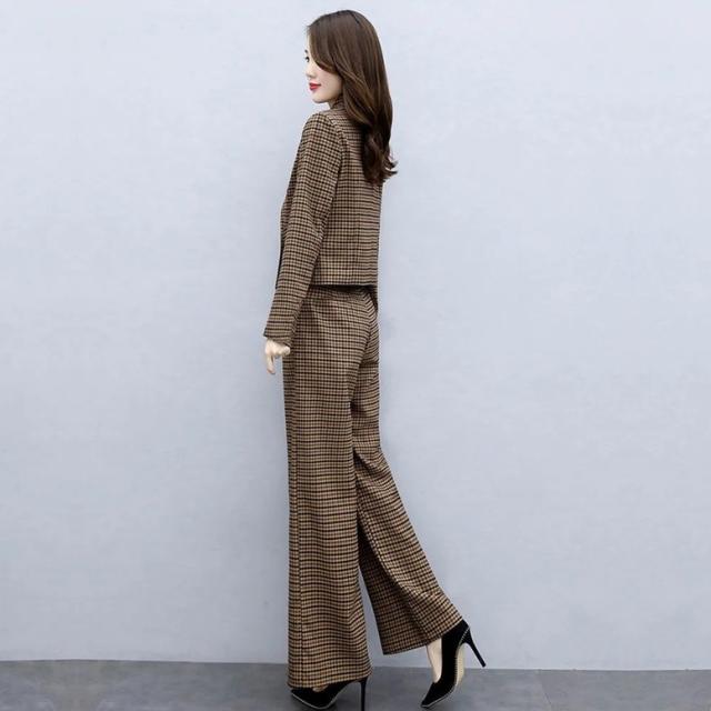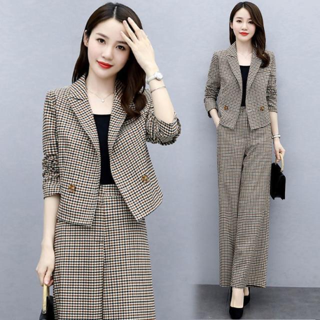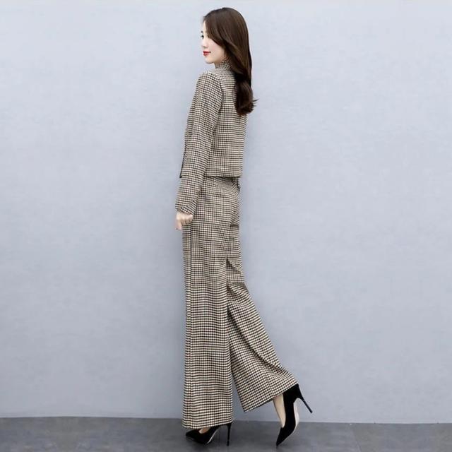 小さめのチェック柄がレトロで大人可愛いパンツスーツ