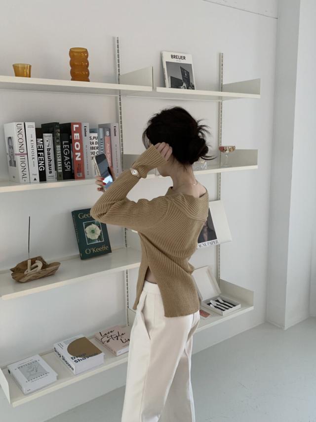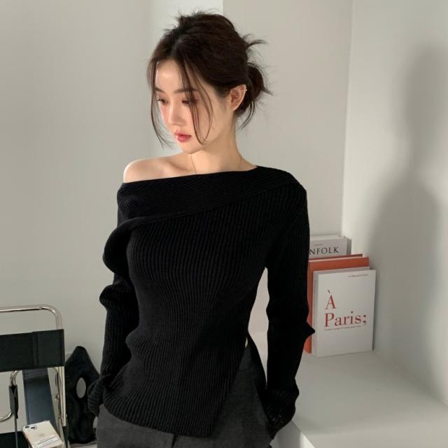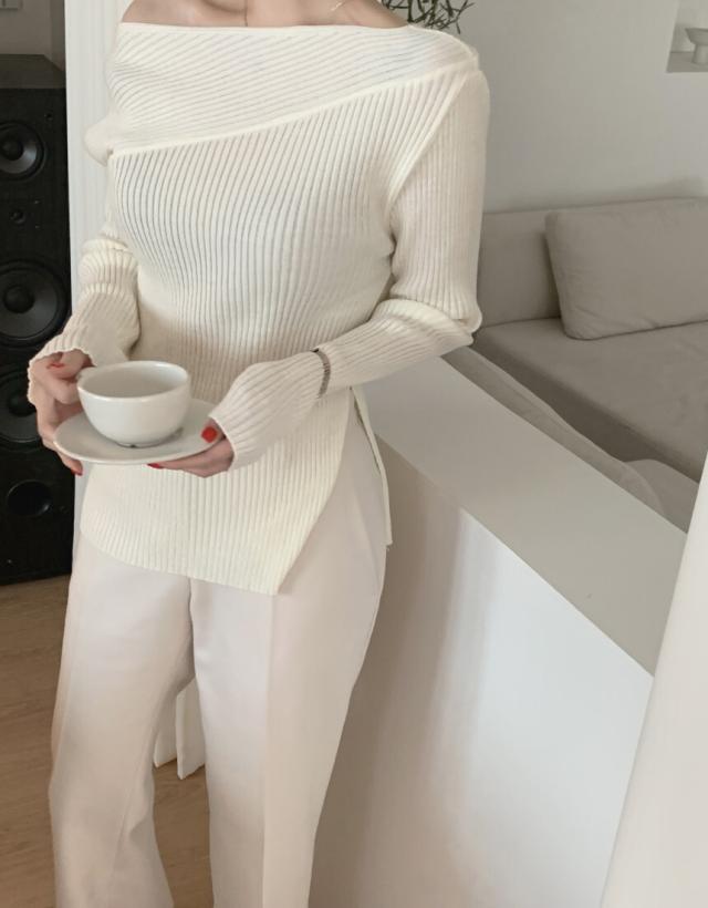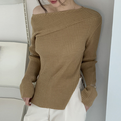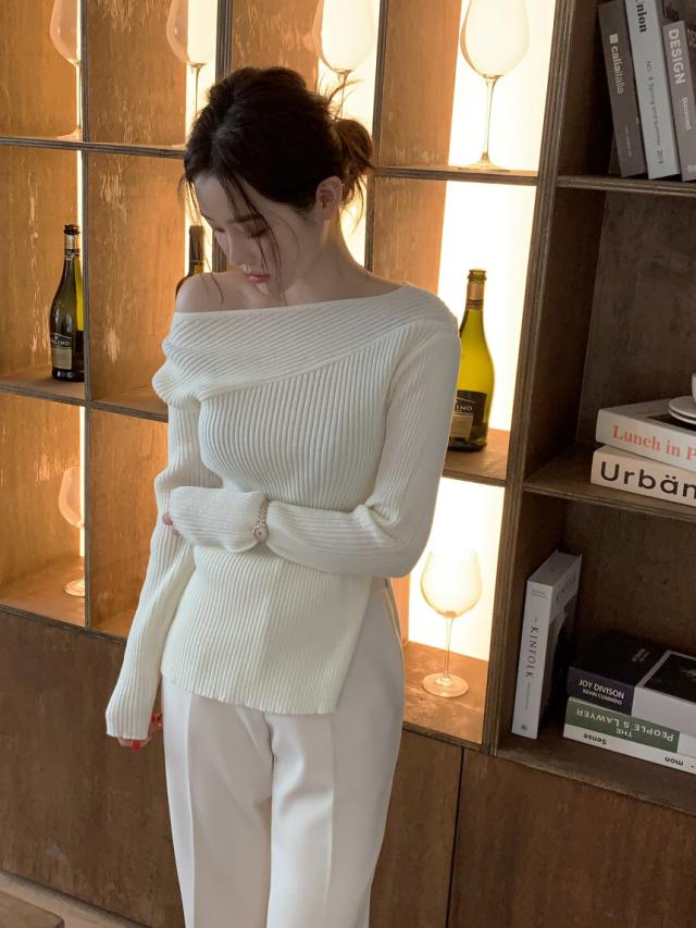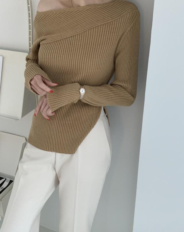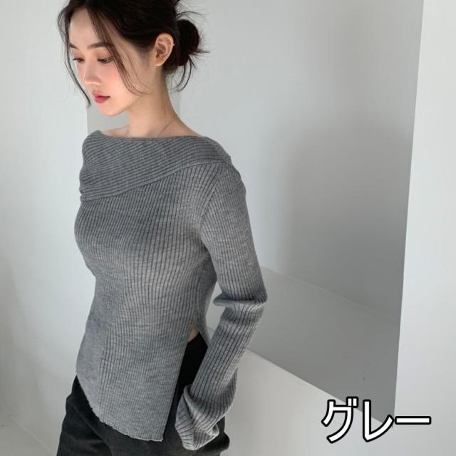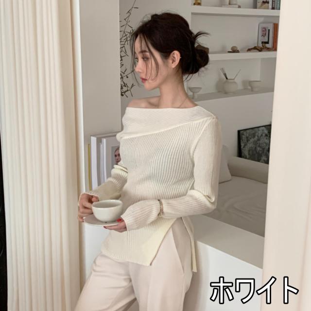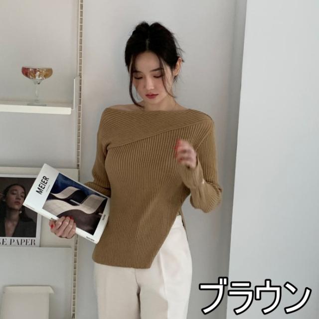 トップス ニットソー 4色 オフショルダー アシンメトリー ニット 長袖 レディース きれいめ セクシー エレガント 高級感 お洒落 オシャレ かわいい 大人可愛い 20代 30代 40代 シンプル カジュアル 春 秋 冬 こなれ感 休日 お出かけ 買い物 女子会 韓国 トレンド 流行 柔らか 着心地 無地 ホワイト 白 ブラウン グレー ブラック 黒 薄手 抜け感 華奢 体型カバー 着痩せ デコルテ 鎖骨 タイト スリム 細身 スリット 脚長 美脚 個性派 個性的 シック モダン デート モテ