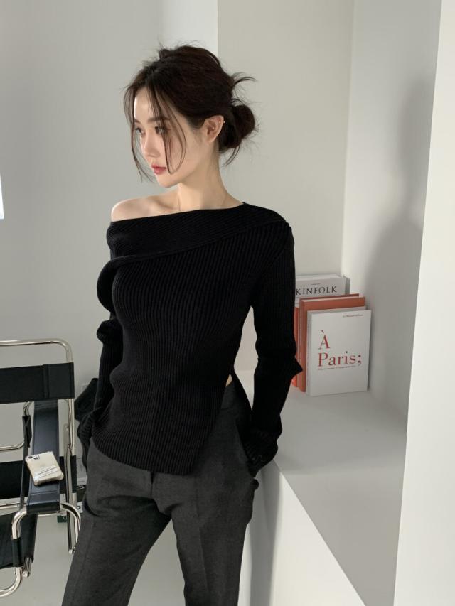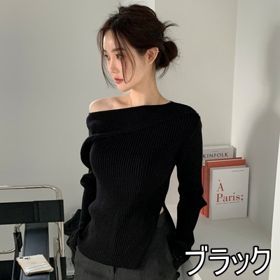 トップス ニットソー 4色 オフショルダー アシンメトリー ニット 長袖 レディース きれいめ セクシー エレガント 高級感 お洒落 オシャレ かわいい 大人可愛い 20代 30代 40代 シンプル カジュアル 春 秋 冬 こなれ感 休日 お出かけ 買い物 女子会 韓国 トレンド 流行 柔らか
