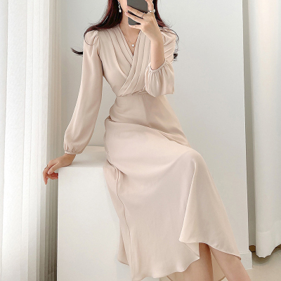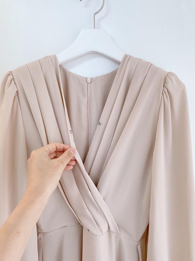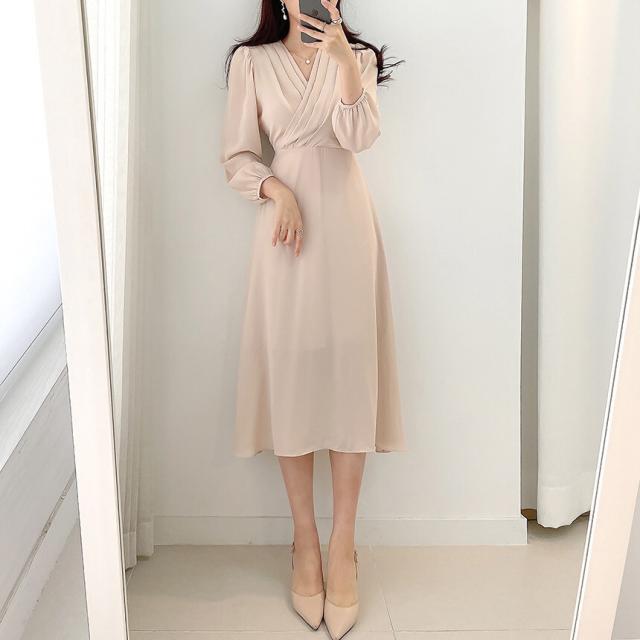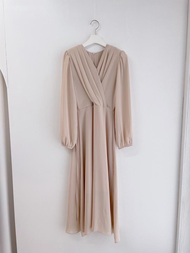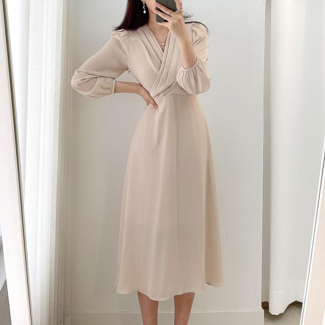 ワンピース ドレス Vネック 長袖 膝丈 ミモレ丈 レディース きれいめ 上品 エレガント 高級感 ロングワンピース タック Aライン 無地 パステルカラー くすみカラー ベージュ ブルー 水色 パフスリーブ お洒落 オシャレ かわいい 大人可愛い フェミニン フェアリー ガーリー