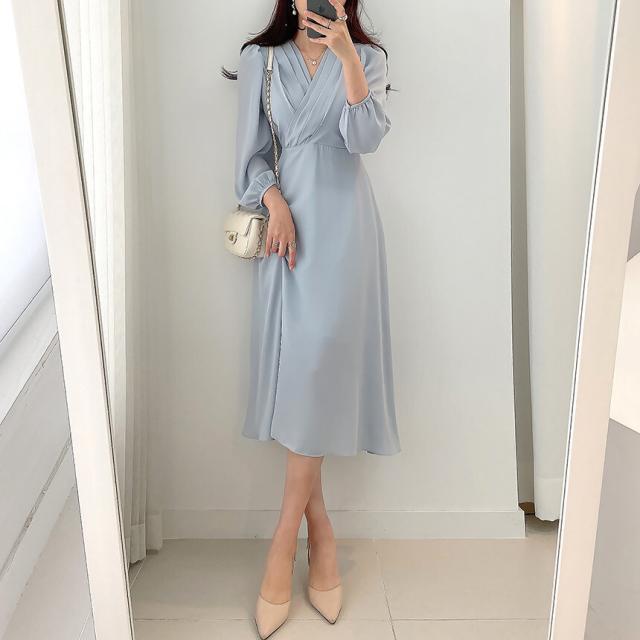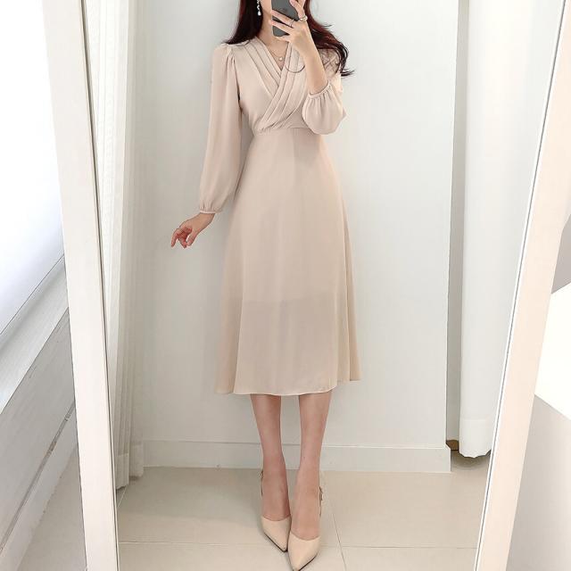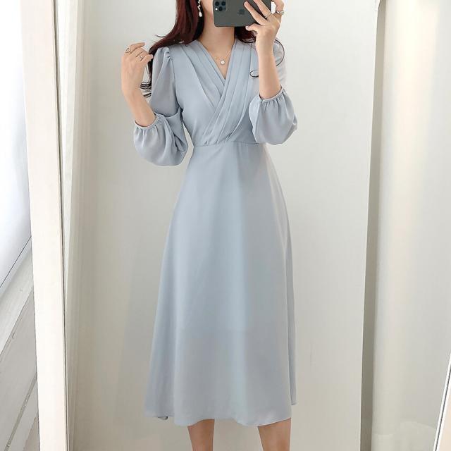 ワンピース ドレス Vネック 長袖 膝丈 ミモレ丈 レディース きれいめ 上品 エレガント 高級感 ロングワンピース タック Aライン 無地 パステルカラー くすみカラー ベージュ ブルー 水色 パフスリーブ お洒落 オシャレ かわいい 大人可愛い フェミニン フェアリー ガーリー 20代 30代 40代 シフォン ハイウエスト 脚長 美脚 スタイルアップ 結婚式 披露宴 二次会 普段使い 普段着 女子会 デート モテ 映え SNS ショッピング お出かけ