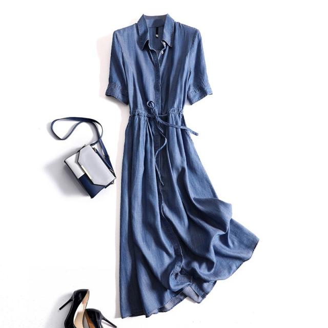 ワンピース レディース シャツワンピース デニムワンピース ロング丈 袖あり 半袖 前開き ボタン 襟付き Aライン ウエストリボン ブルーデニム 大人可愛い シンプル カジュアル おしゃれ お洒落 かっこいい 大人女子 こなれ感 ラフ クール 存在感 抜け感 M L XL 青 無地 夏 10代 20代 30代 40代 50代 ママ 学生 通学 デート お出かけ 女子会 休日 アウトドア イベント リゾート 旅行 定番 プレゼント ギフト 体型カバー モテ 楽ちん 普段使い 着回し 重ね着