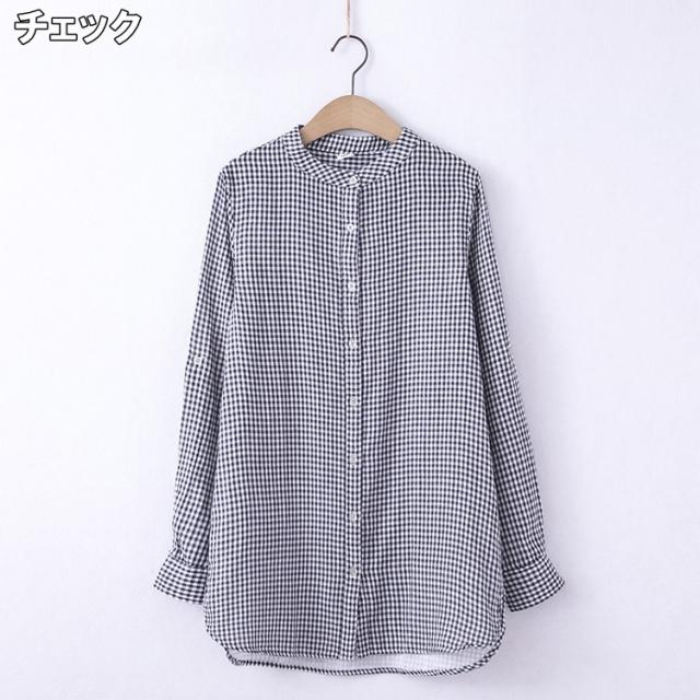 シャツ レディース トップス ブラウス ノーカラーシャツ S M L XL ホワイト 白 グレー 灰色 ネイビー 紺 チェック ギンガムチェック 無地 大人カラー くすみカラー 春 秋 長袖 ノーカラー フロントボタン 前開き ロング丈 ミドル丈 ストレート ルーズ ゆったり ゆる ママ