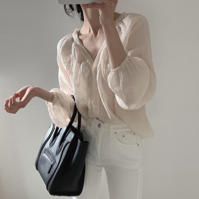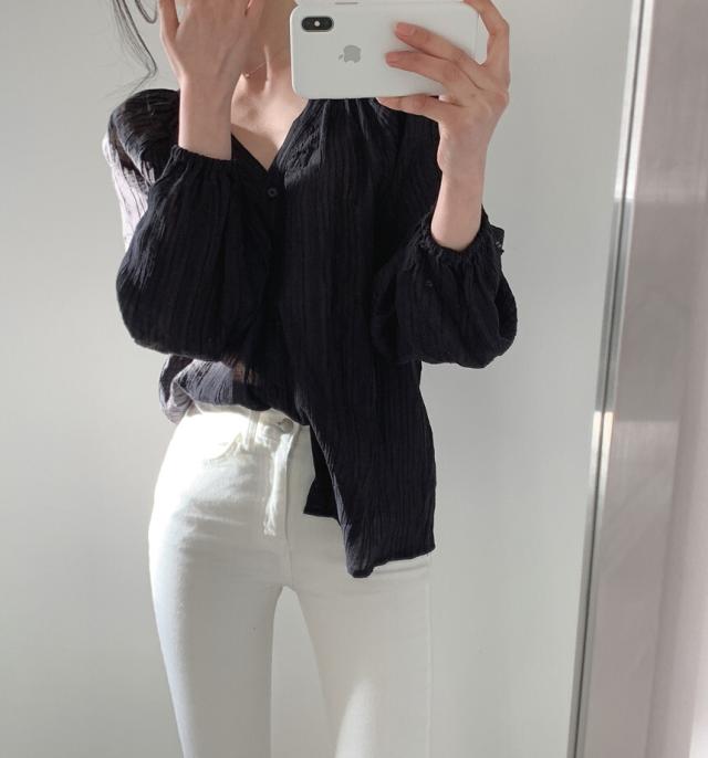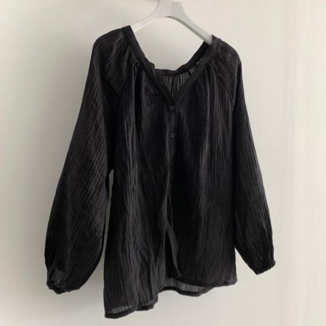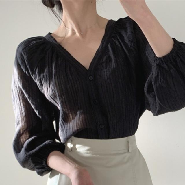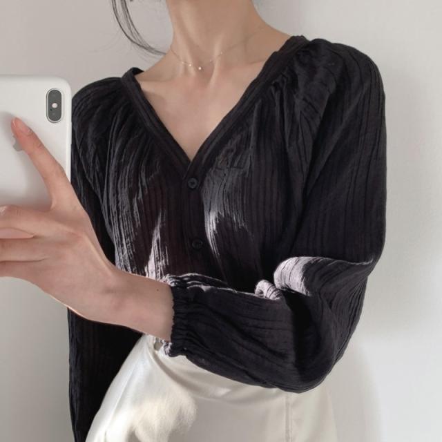 トップス レディース カーディガン ブラウス 袖あり 長袖 Vネック シャーリング 透け感 前開き ボタン 大人可愛い シンプル カジュアル 大人 おしゃれ お洒落 レトロ 大人女子 こなれ感 ラフ 抜け感 フリーサイズ ワンサイズ アイボリー 黒 ブラック 無地 しじれ 春 秋 10代
