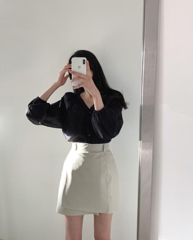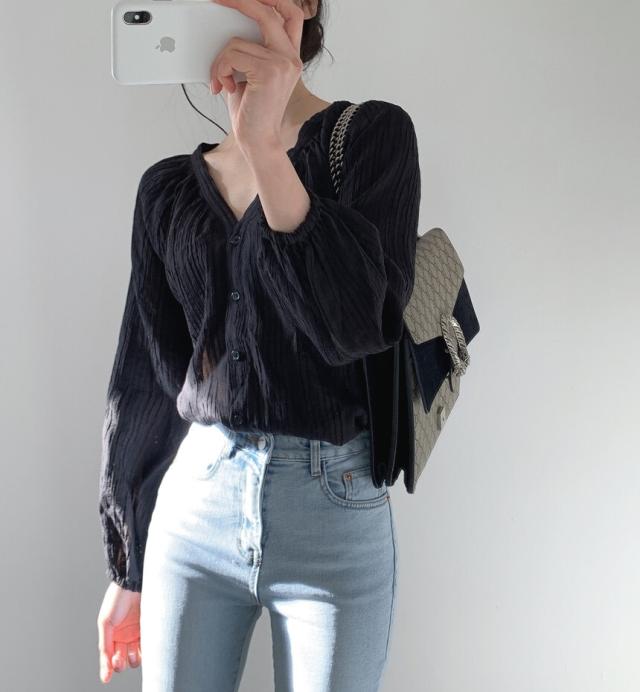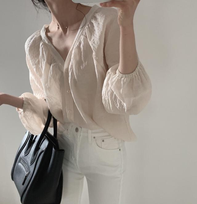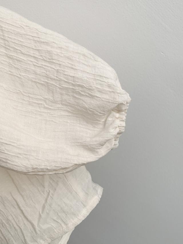 凸凹生地と胸元、袖口のシャーリングデザインが大人のこなれ感を演出◎