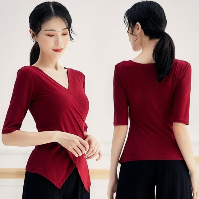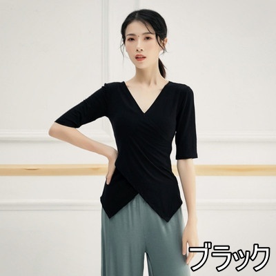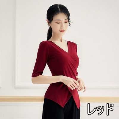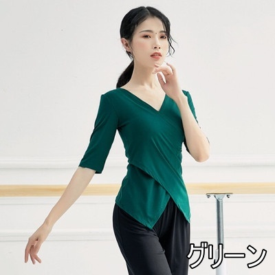 トップス ダンスウェア ヨガ 運動 スポーツ レディース 伸縮性 Vネック 7分袖 タイト スリム 細身 とろみ オシャレ お洒落 きれいめ かわいい 大人可愛い こなれ感 エレガント 柔らか 薄手 通気性 体型カバー 着痩せ 細見え 無地 緑 グリーン ホワイト 白 黒 ブラック 赤