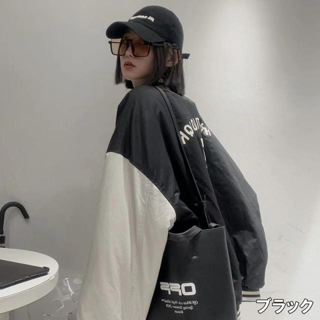 スタジャン レディース アウター ジャケット ブルゾン ジャンパー ワンサイズ フリーサイズ ブラック 黒 グリーン 緑 バイカラー ライン 大人カラー くすみカラー 秋カラー 無地 バックロゴ バックシャン ロゴ プリント 長袖 ボリューム袖 ランタンスリーブ ラグラン
