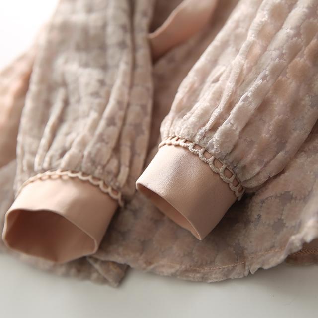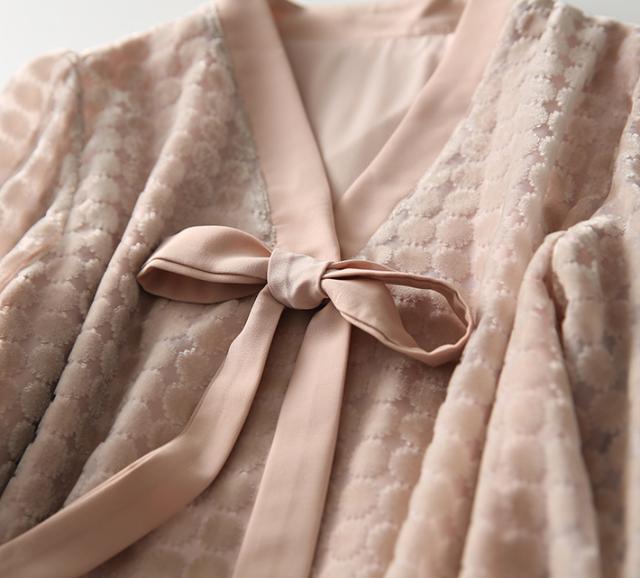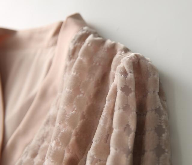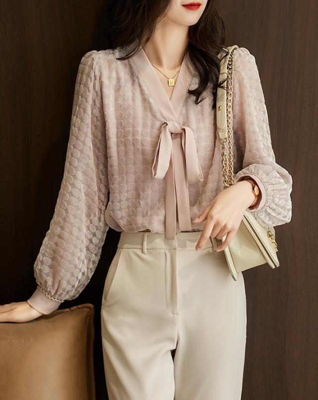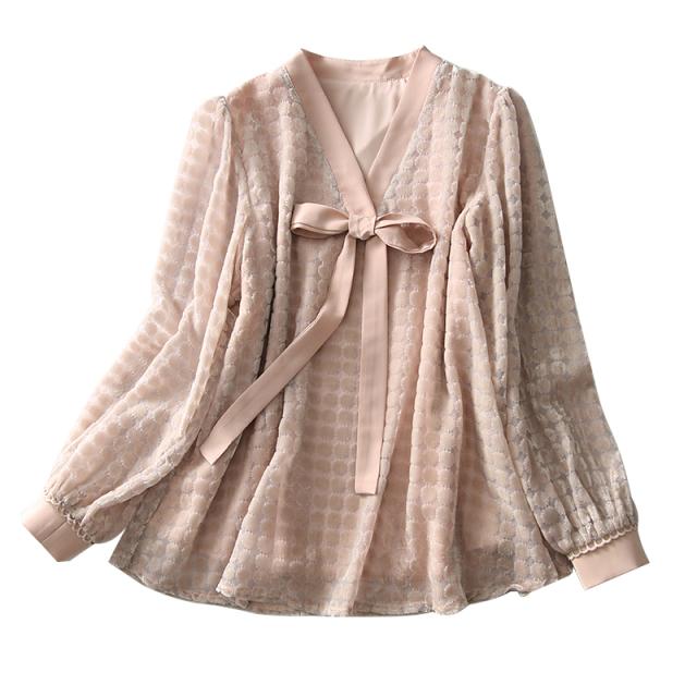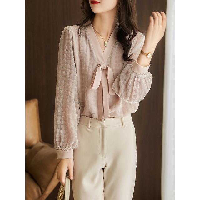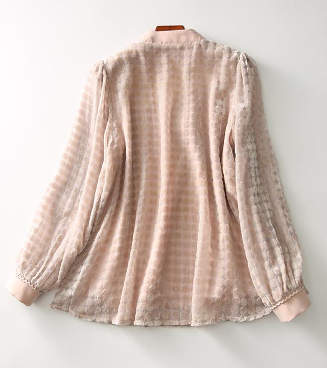 トップス レディース ブラウス プルオーバー 袖あり 長袖 Vネック ボウタイリボン 透け感 ドット ベロア シースルー 大人可愛い きれいめ 大人 上品 おしゃれ お洒落 大人女子 こなれ感 クール エレガント 華やか 存在感 とろみ感 抜け感 M L くすみピンク 春 秋 20代 30代