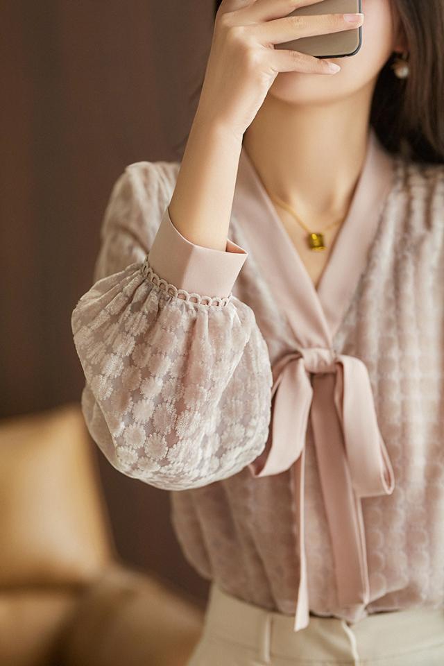 落ち着いたピンクカラーの長袖Vネックボウタイブラウス。
