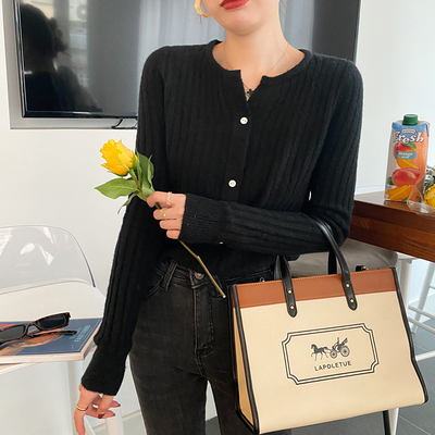 ラウンドネックのカーディガン風のプルオーバーニット。