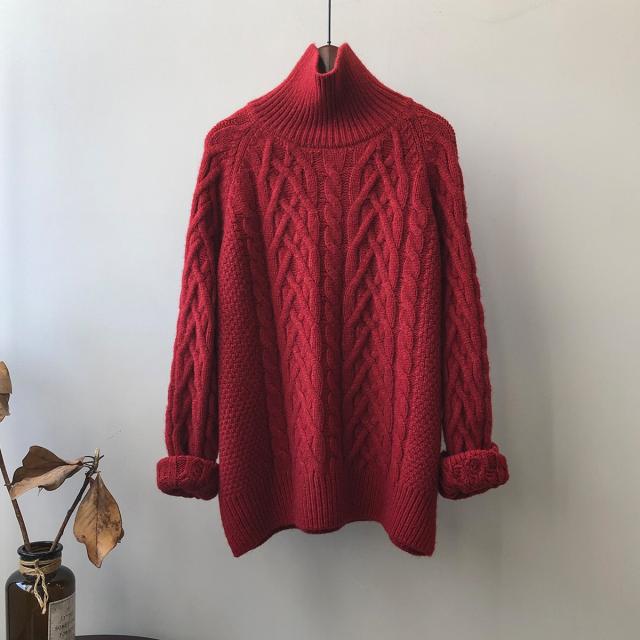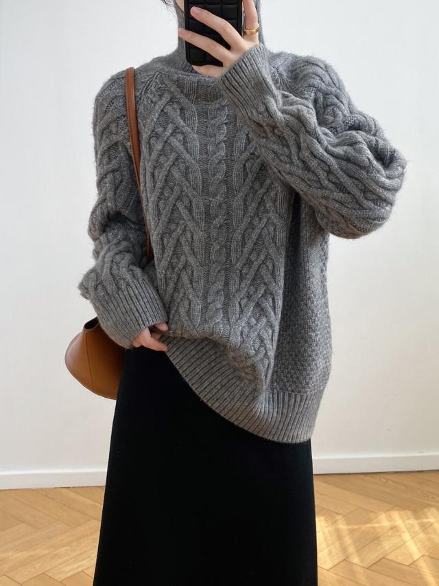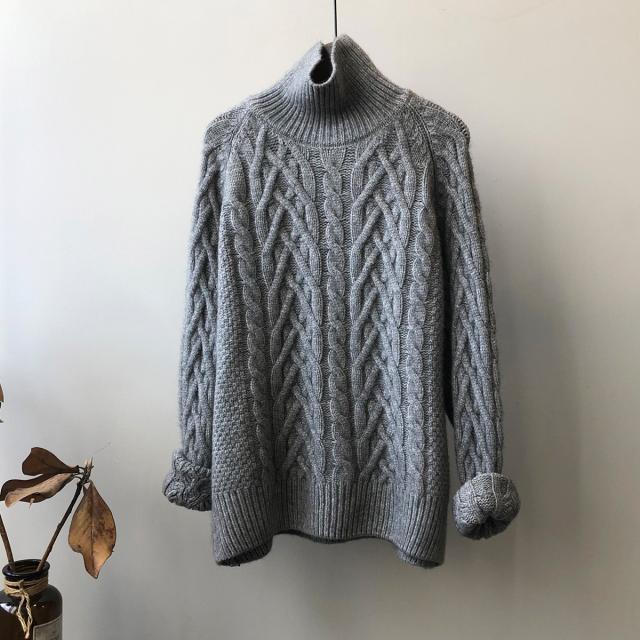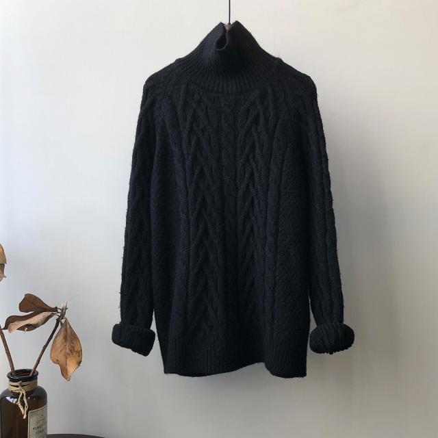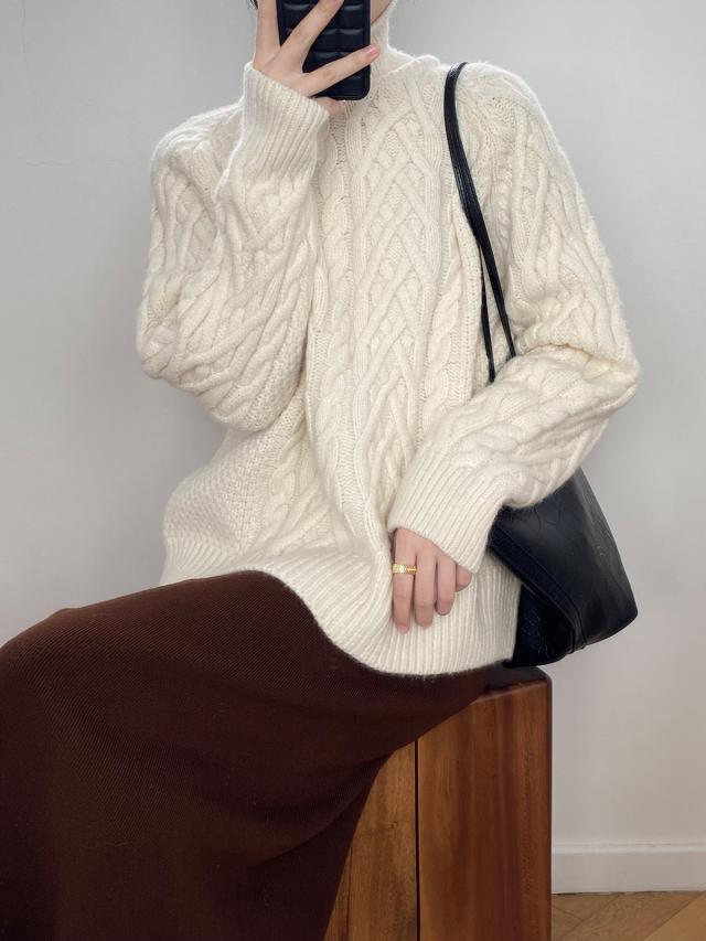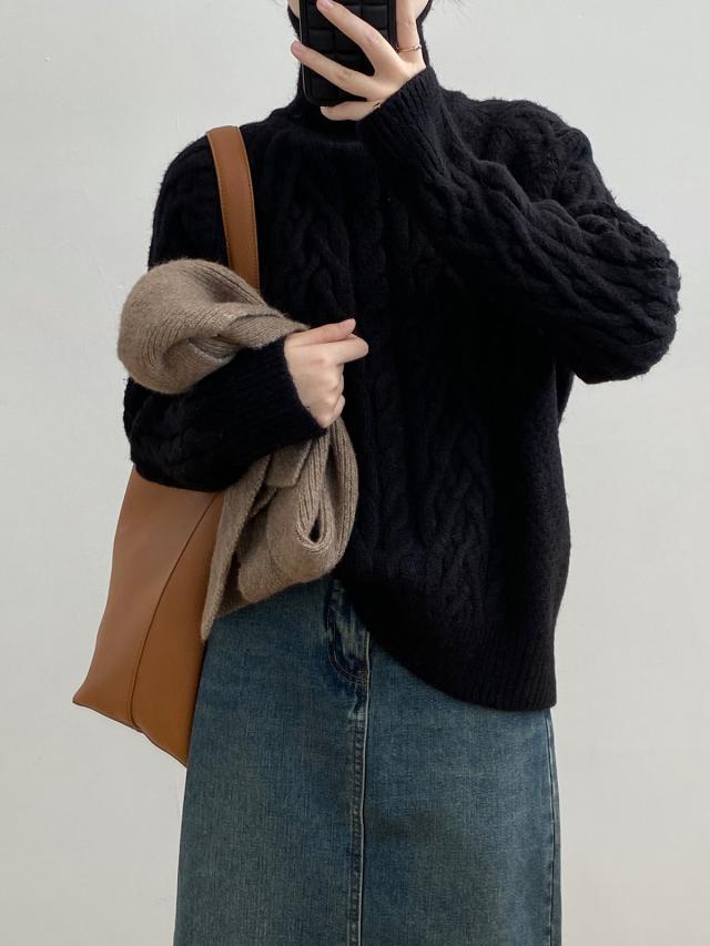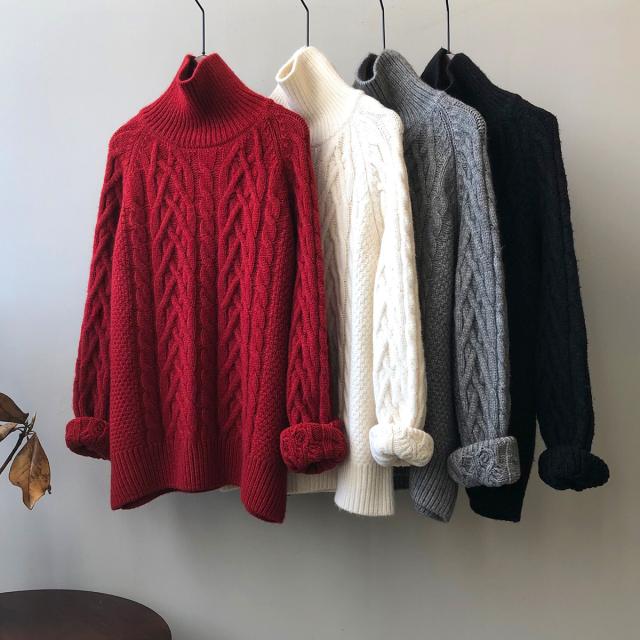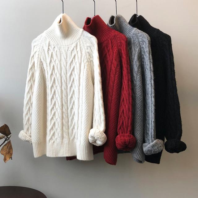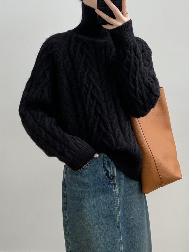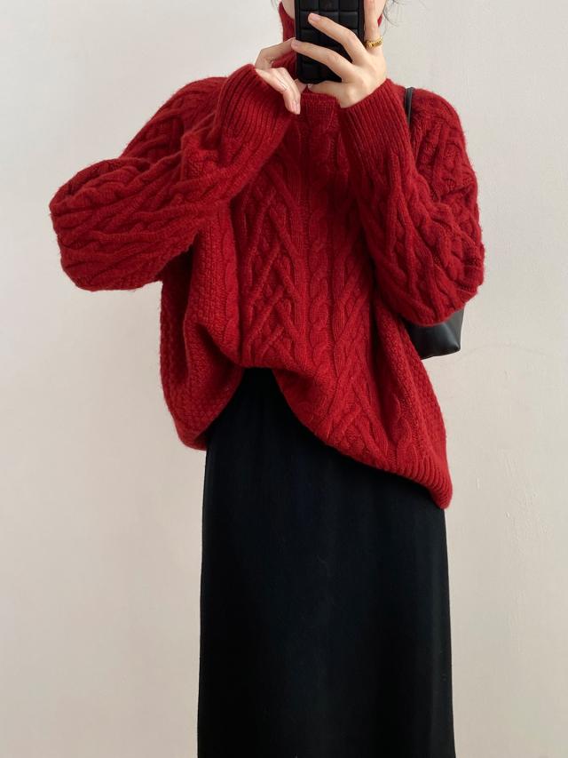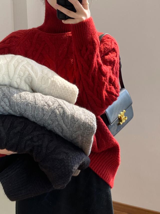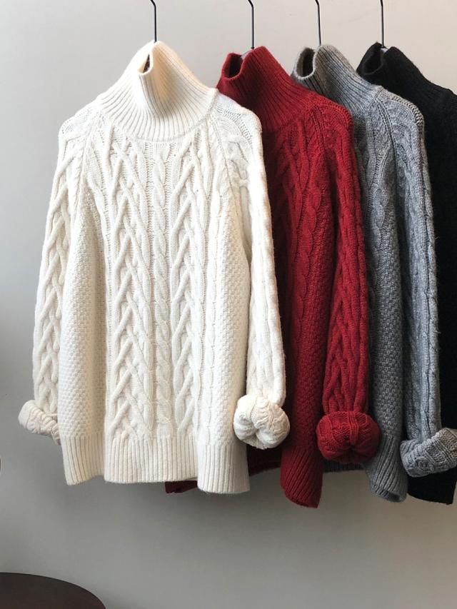 4色カラバリ、ケーブルニットタートルネックセーター。