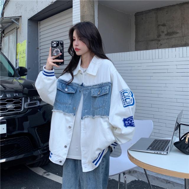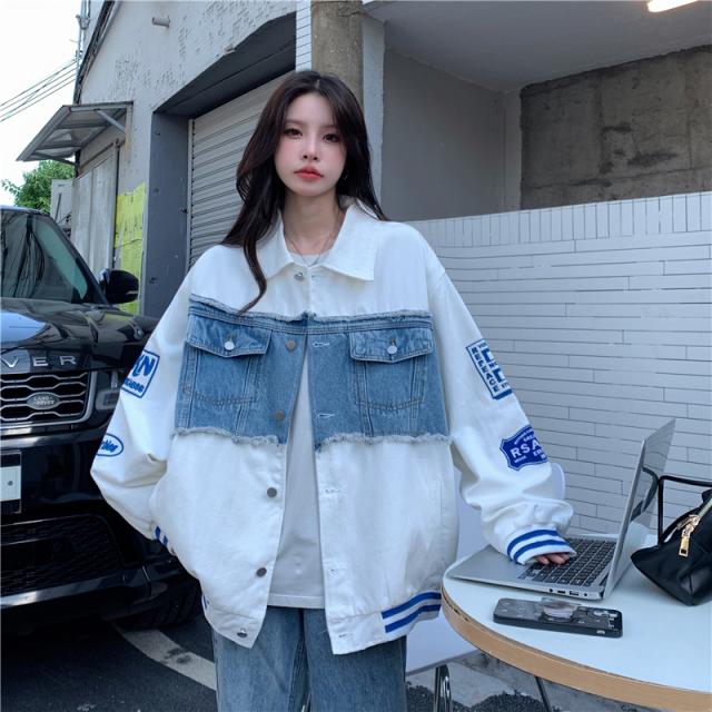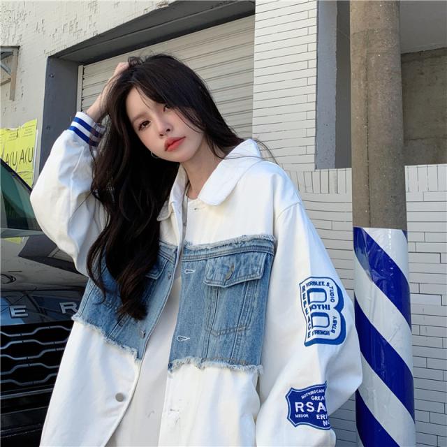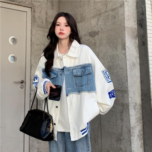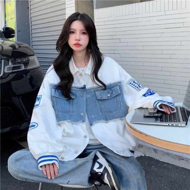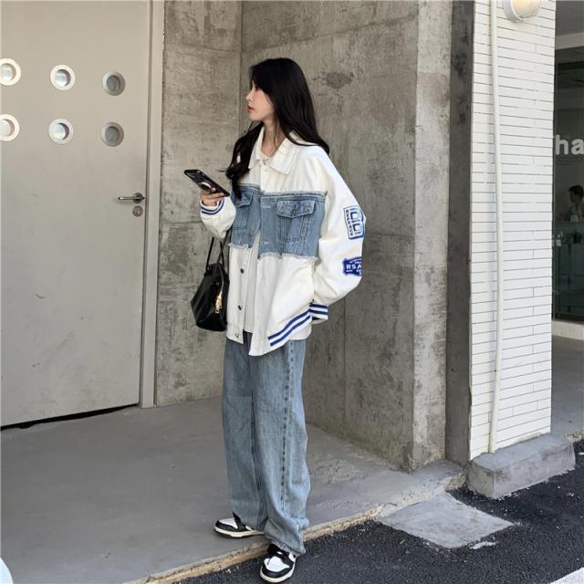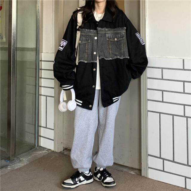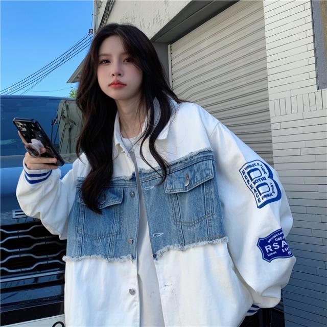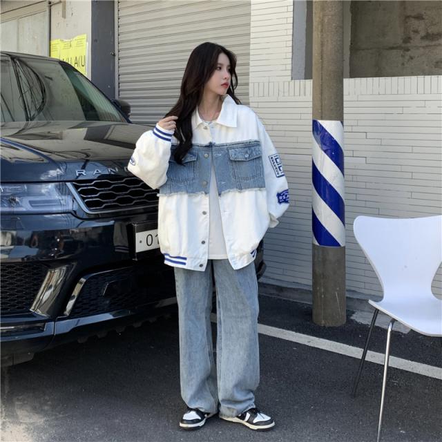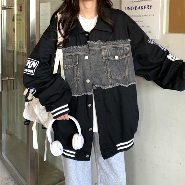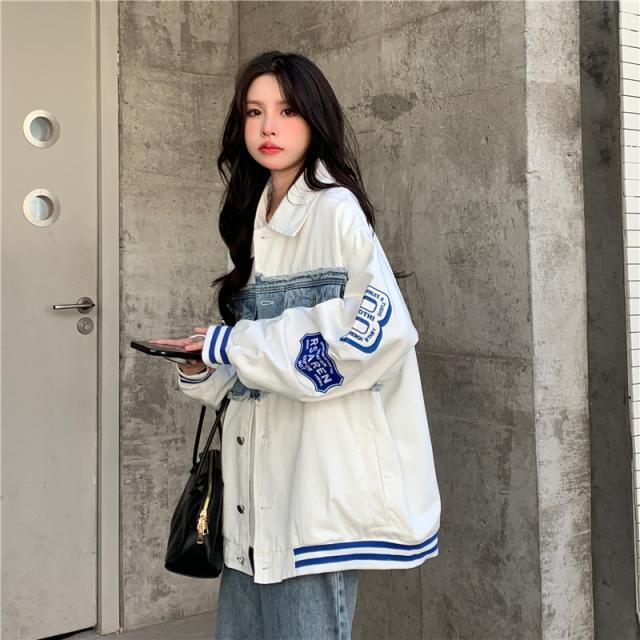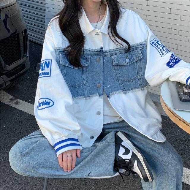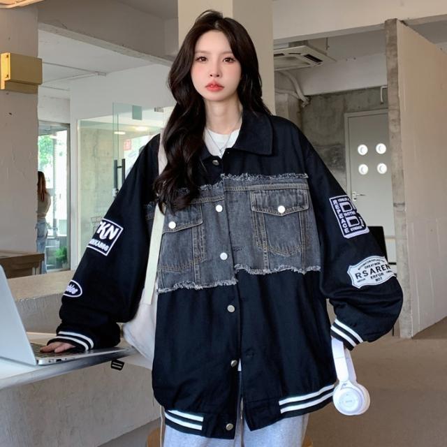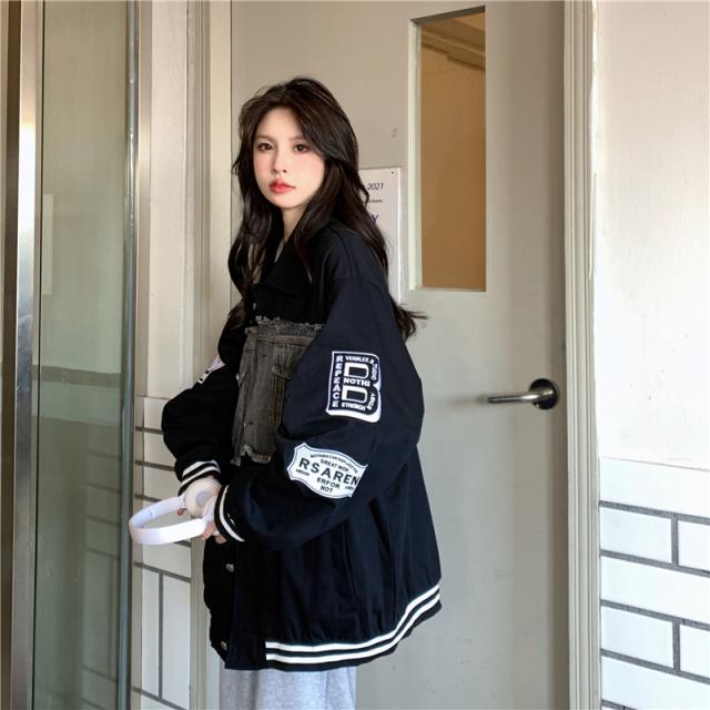 アウター ジャケット デニム 切り替え オーバーサイズ レディース 春 秋 冬 クール かっこいい ボーイッシュ メンズライク お洒落 オシャレ 黒 ブラック ホワイト 白 ゆったり 大きめ М L XL 体型カバー 着痩せ ワイド 前開き 襟付き 華奢 20代 30代 40代 ルーズ ラフ こなれ感 普段着 普段使い プリント ワッペン アメカジ ストリート スポーティー 個性的 個性派 ベースボールジャケット ライン ボリューム ランタンスリーブ アンティーク ヴィンテージ レトロ可愛い
