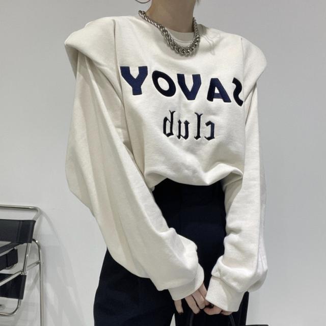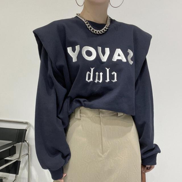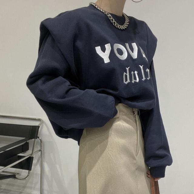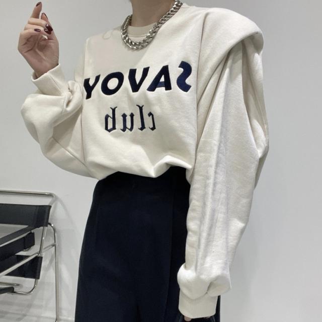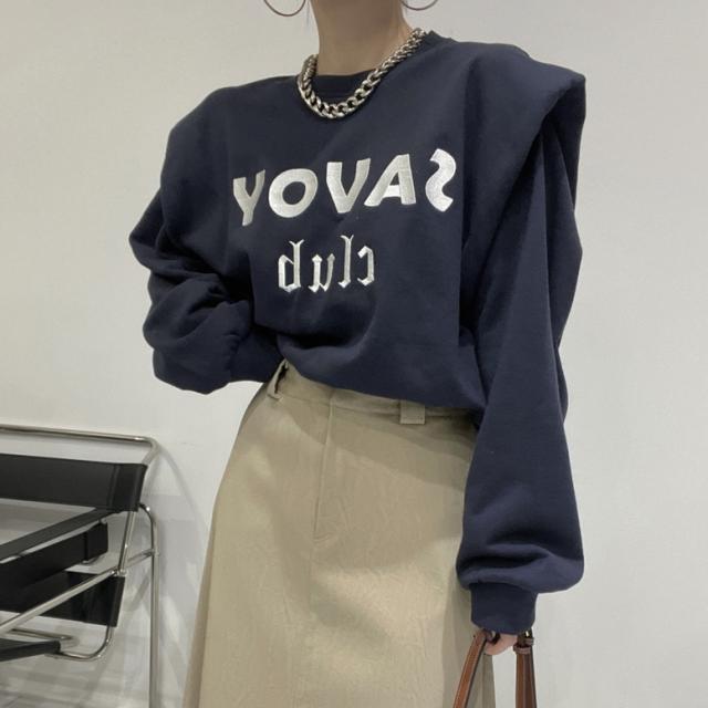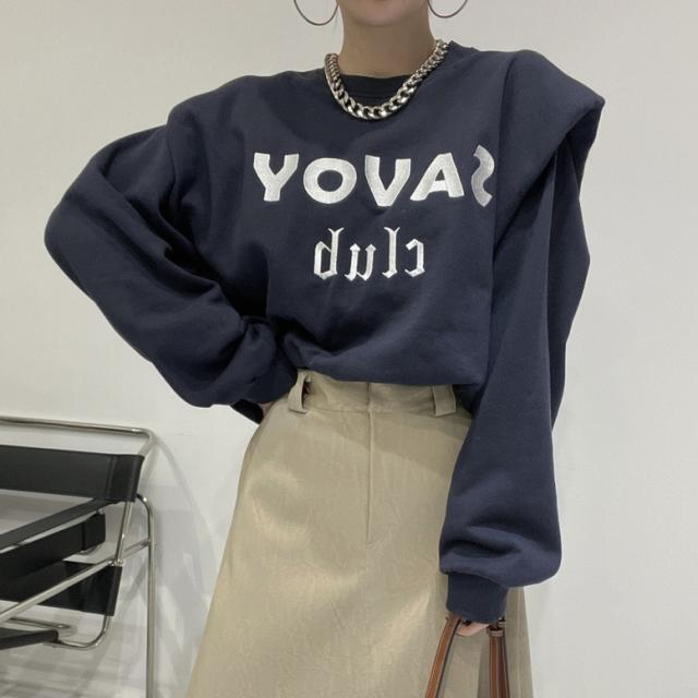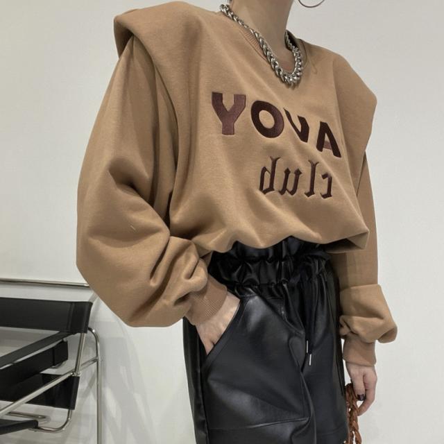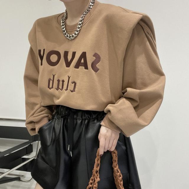 ロゴ入りパワショルスウェットプルオーバー トップス レディース スウェット プルオーバー パワーショルダー ロゴ入り トレーナー 長袖 袖コンシャス クルーネック バルーンスリーブ 茶色 紺 灰色 ブラウン ネイビー ベージュ グレー 大人可愛い きれいめ 上品 エレガント ガーリー マニッシュ ルーズ 春 夏 秋 冬 二次会 オフィス OL 通勤 学生 通学 お出かけ パーティー イベント 休日 アウトドア 体型カバー オーバーサイズ ゆったり くすみカラー ベイクドカラー アースカラー