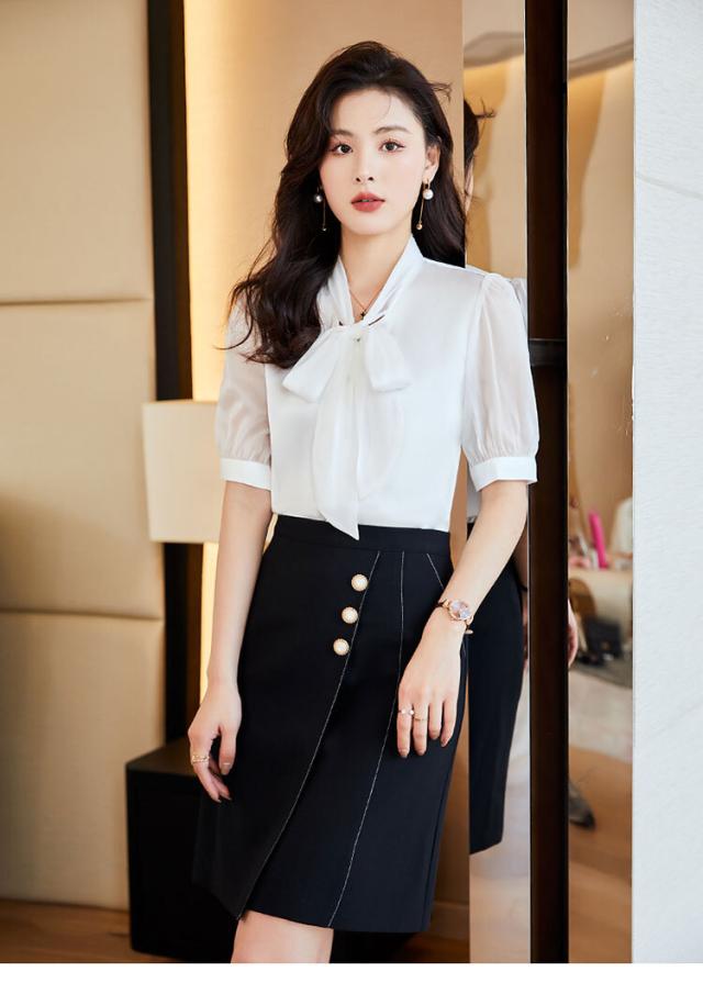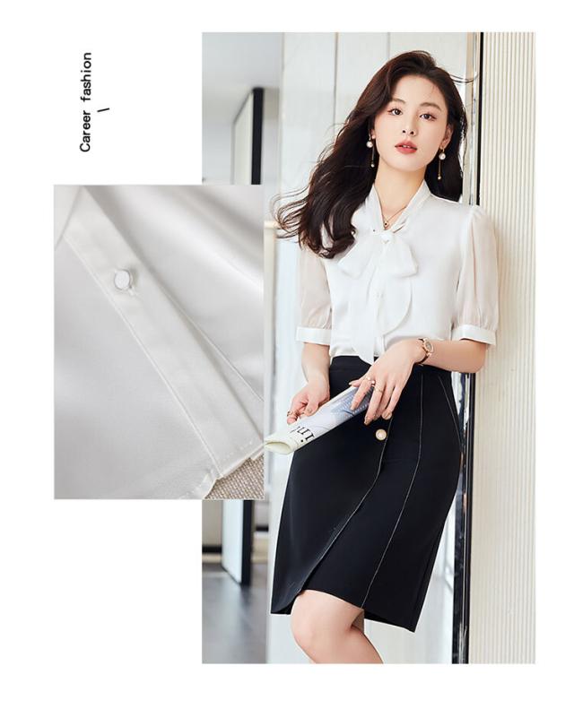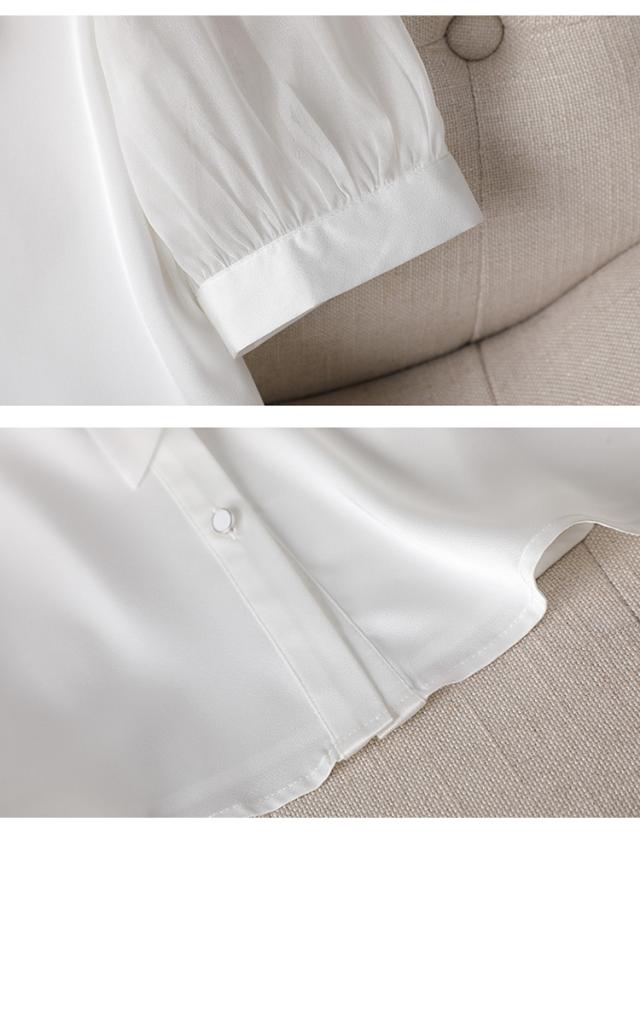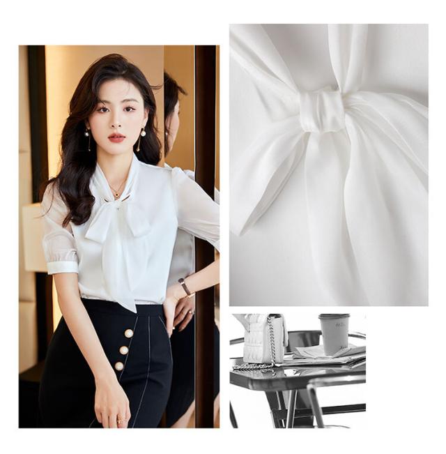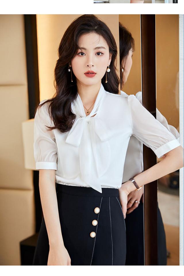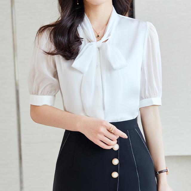 トップス レディース 白トップス ボウタイブラウス リボンブラウス 半袖 五分袖 5分袖 パフスリーブ ボタン 前開き シャツ シフォン かわいい 大人可愛い きれいめ シンプル 大人 上品 おしゃれ お洒落 かっこいい 大人女子 こなれ感 クール エレガント 華やか 存在感