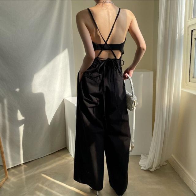 オールインワン ステッチラインキャミソールオールインワンパンツ レディース ジャンプスーツ オーバーオール ジッパー ダブルポケット ベアトップ パンツオールインワン サロペット ワイドパンツ サスペンダー バッククロス ハイウエスト ロンパース つなぎ ノースリーブ 黒