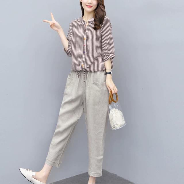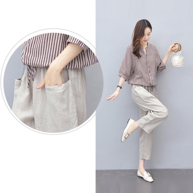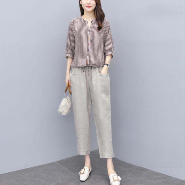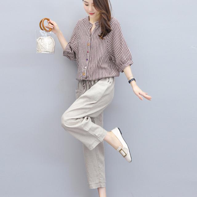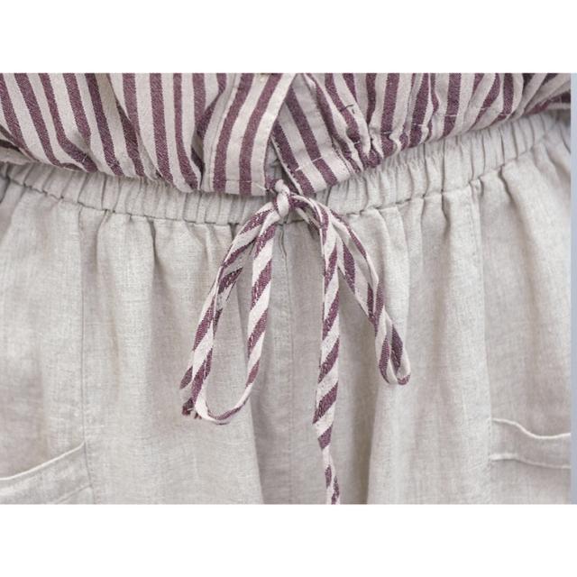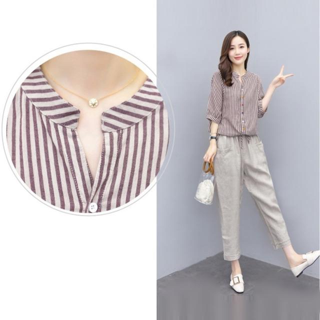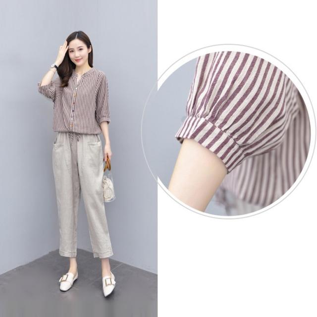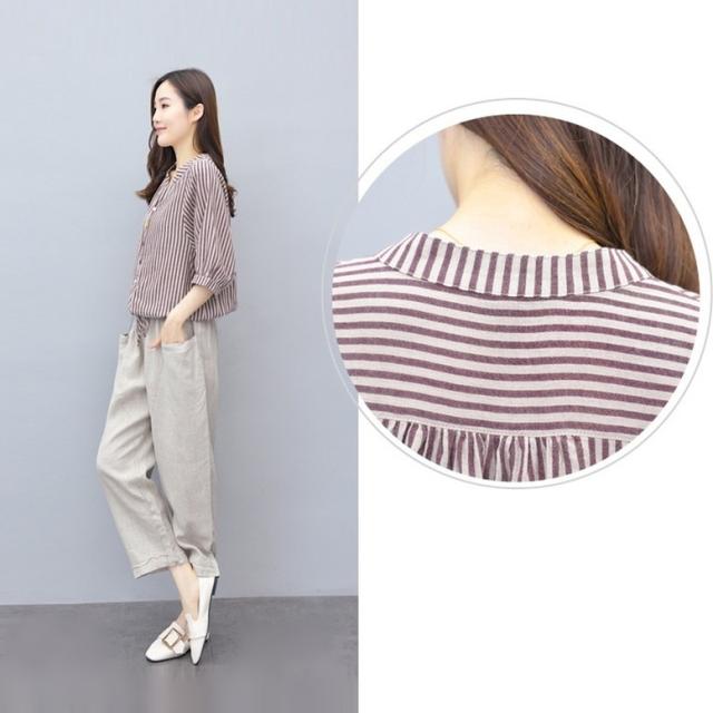 ストライプスキッパー7分袖シャツ トップス レディース シャツ ストライプ柄 ブラウス スキッパー 7分袖 コットンシャツ リネンシャツ ナチュラル 茶色 ココアブラウン 大人可愛い きれいめ 上品 エレガント フォーマル ガーリー マニッシュ ルーズ キュート レトロ 春 夏 秋