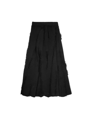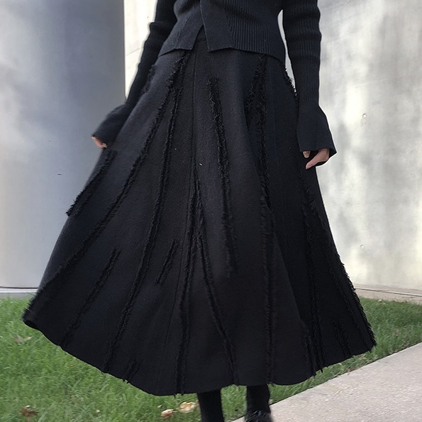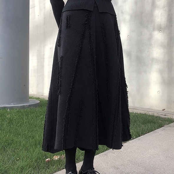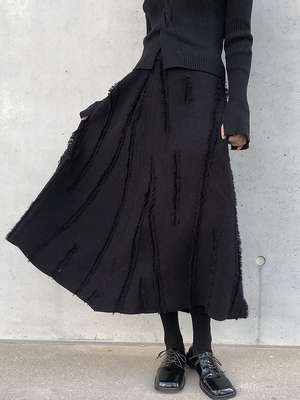 スカート ロングスカート ダメージ フリンジ ニット レディース Aライン プリーツ ロング丈 ミモレ丈 ふんわり ボリューム 個性派 個性的 オシャレ お洒落 大人可愛い 上品 ゴージャス パンク ロック クール かっこいい ゴシック 無地 ブラック 黒 ハイウエスト 脚長 美脚 スタイルアップ М L ウエストゴム 楽ちん 映え SNS 写真 春 秋 冬 20代 30代 40代 普段使い 普段着 ショッピング お出かけ シック モード 主役 存在感 高級感 こなれ感 あったか 暖かい 防寒