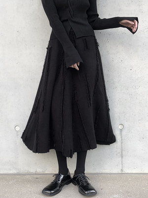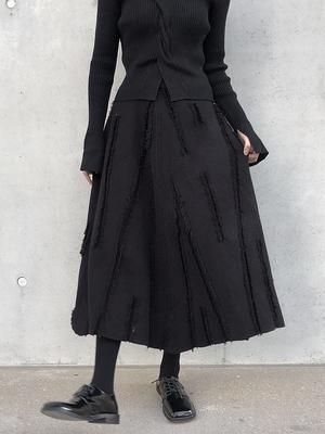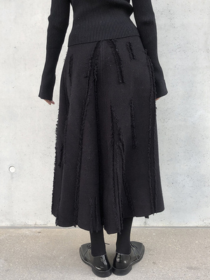 スカート ロングスカート ダメージ フリンジ ニット レディース Aライン プリーツ ロング丈 ミモレ丈 ふんわり ボリューム 個性派 個性的 オシャレ お洒落 大人可愛い 上品 ゴージャス パンク ロック クール かっこいい ゴシック 無地 ブラック 黒 ハイウエスト 脚長 美脚