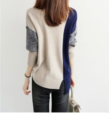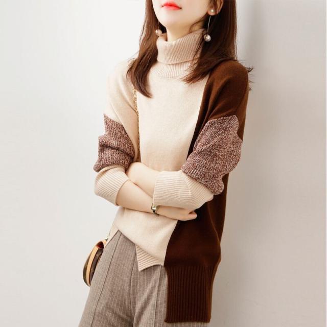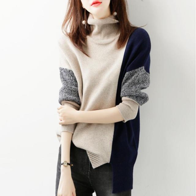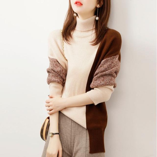トップス セーター ニット 袖あり 長袖 タートルネック ブロッキングニット 大人可愛い きれいめ カジュアル 大人 上品 おしゃれ お洒落 かっこいい レトロ 大人女子 こなれ感 ラフ クール ルーズ 個性的 存在感 抜け感 S M L アイボリー 紺 ネイビー ブラウン 茶色 イエロー