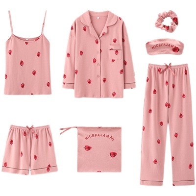パジャマ 7点セット いちご柄 半袖 長袖 レディース キャミソール パンツ ロングパンツ ショートパンツ 巾着 アイマスク シュシュ ゆったり 大きめ 大きいサイズ М L XL 2XL かわいい 大人可愛い お洒落 オシャレ 韓国 トレンド 流行 オールシーズン 春 夏 秋 冬 10代 20代