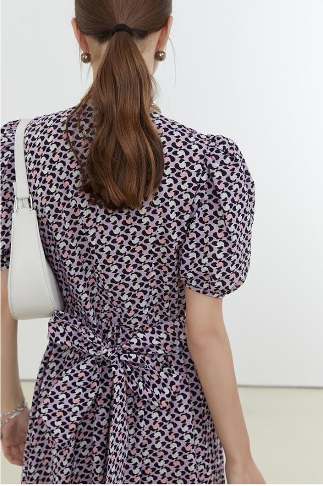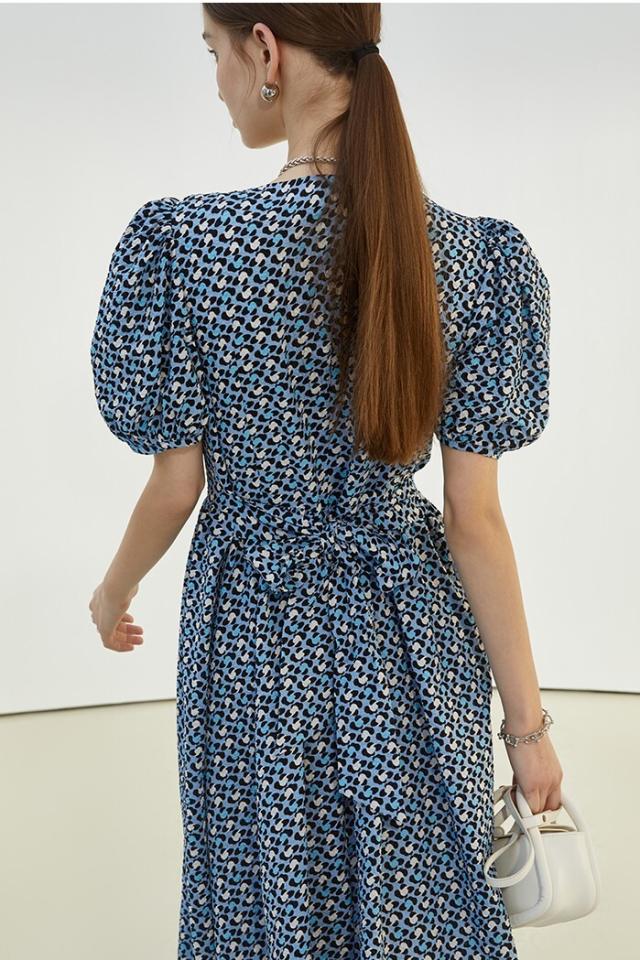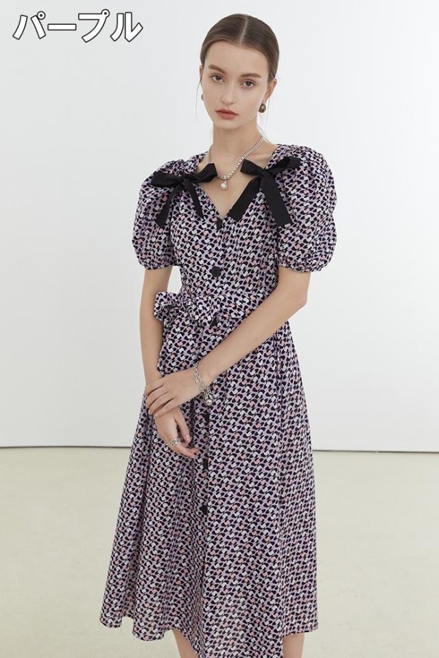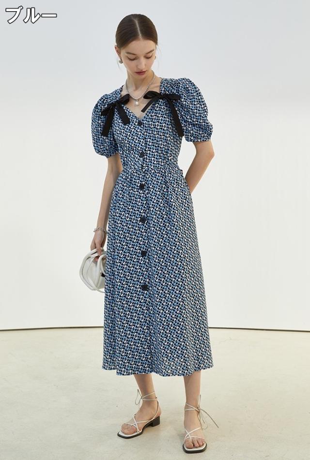 ワンピース レディース ミディワンピ 花柄ワンピ S M L ブルー 青 パープル 紫 大人カラー 花柄 フラワー フローラル リボン フロントボタン 春 夏 半袖 パフスリーブ リボン ミドル丈 ミドル ミディ丈 ミディアム 膝丈 膝下 フレア Aライン ハイウエスト 脚長 スタイルアップ