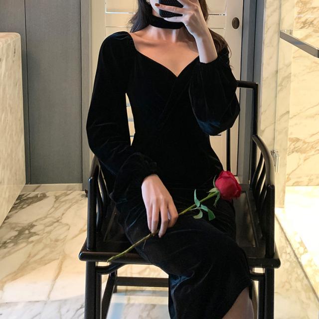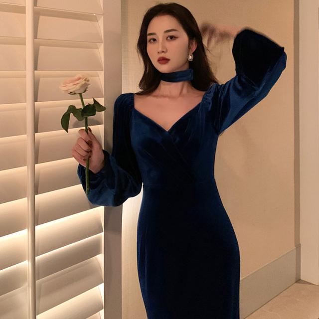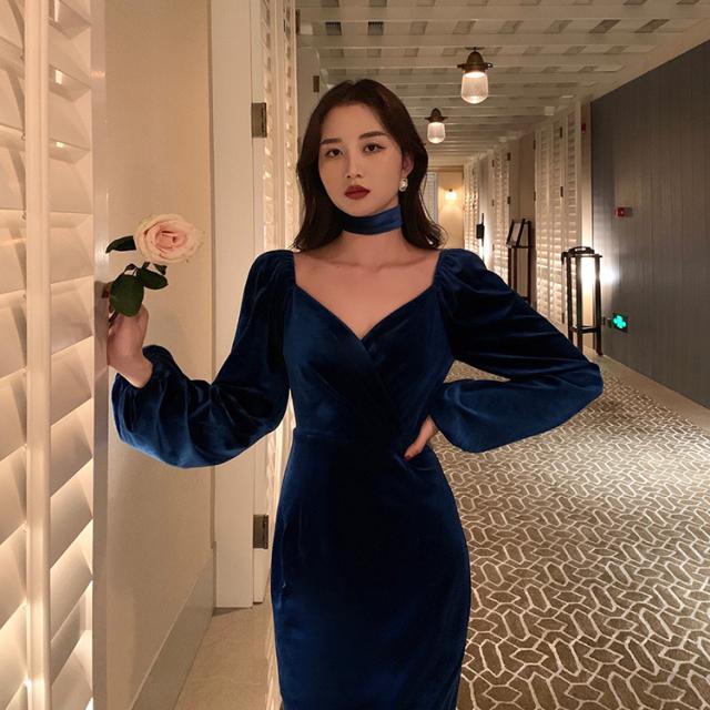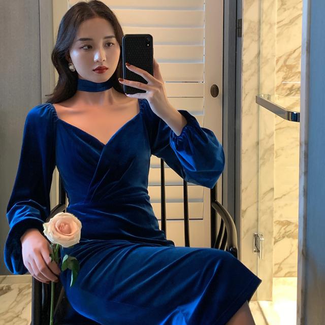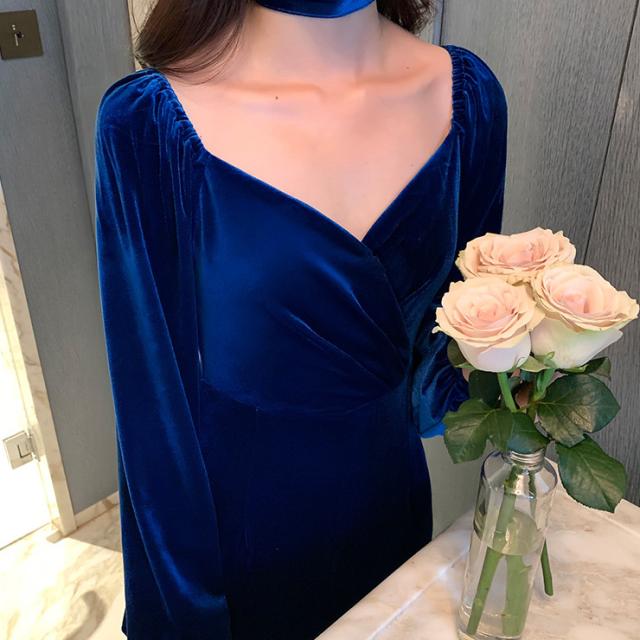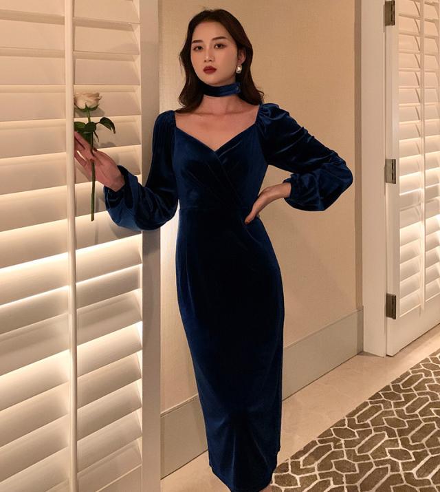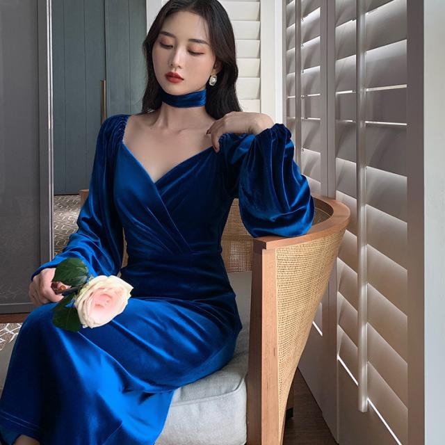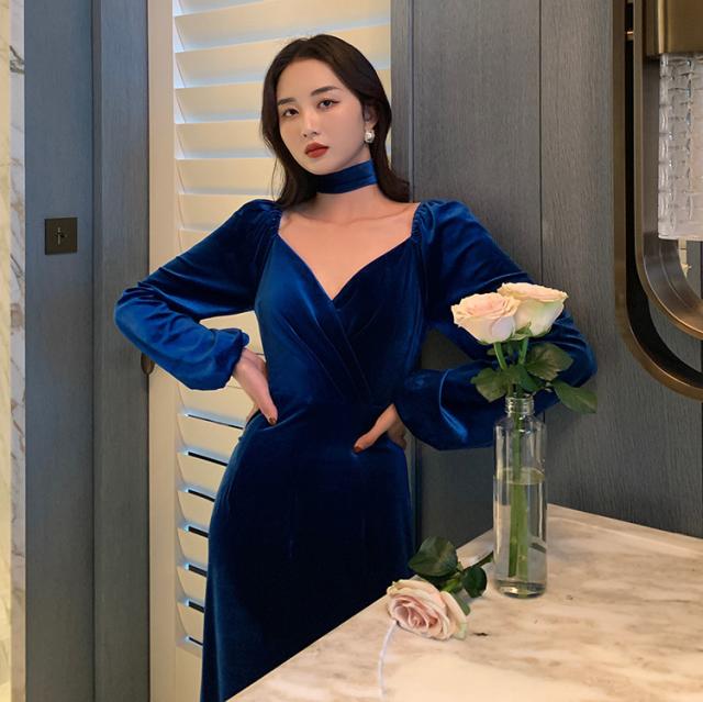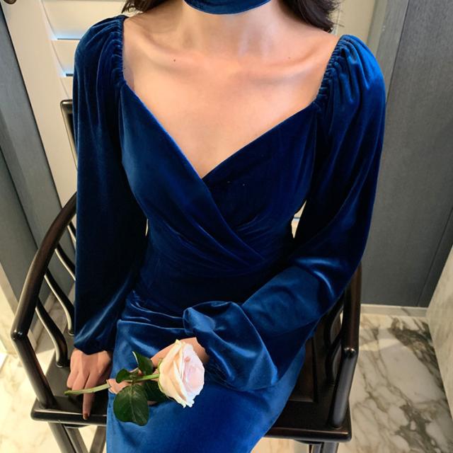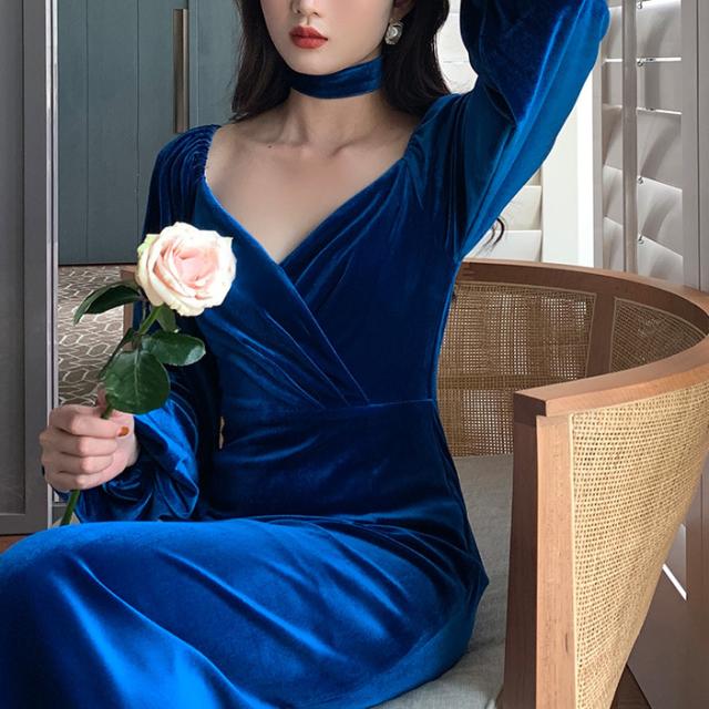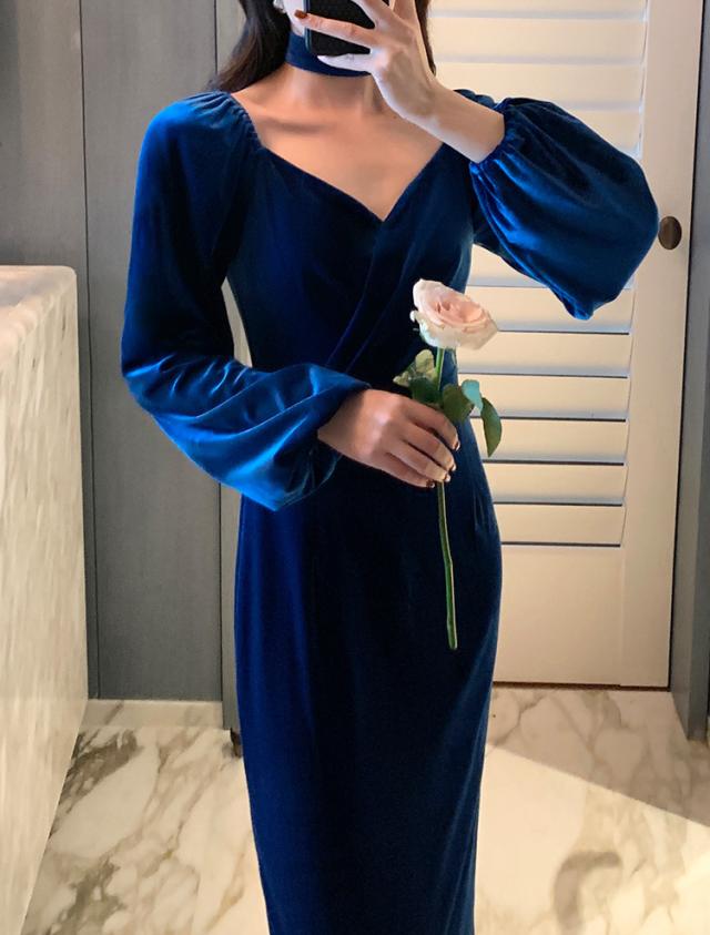 冬 ベルベット ドレス パーティドレス ミモレ丈ドレス フォーマルドレス ワンピドレス ミディアム丈 袖あり 長袖 ランタンスリーブ Vネック 襟なし 細身 タイプA プリーツ ハイウエスト レギュラー 異素材MIX 大人可愛い きれいめ 大人 上品 おしゃれ 大人女子 ガーリー 個性的 モード系 エレガント フォーマル クラシック お嬢様 無地 20代 30代 レディース 女性用 ママ OL デート 休日 リゾート レストラン ファッション 美脚 インスタ映え 冬 パーティー ワンサイズ レトロブルー