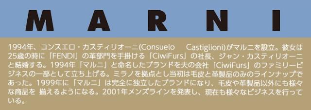 | 1994年、コンスエロ・カスティリオーニ(Consuelo Castiglioni)がマルニを設立。彼女は25歳の時に「FENDI」の皮部門を手掛ける「CiwiFurs」の社長、ジャン・カスティリオーニと結婚する。1994年「マルニ」と命名したブランドを夫の会社「CiwiFurs」のファミリービジネスの一部として立ち上げる。ミラノを拠点とし当初は毛皮と革製品のみのラインナップであった。1999年に「マルニ」は完全に独立したブランドになり、毛皮や革製品以外にも様々な商品を 揃えるようになる。2001年メンズラインを発表し、現在も様々なビジネスを行っている。 |