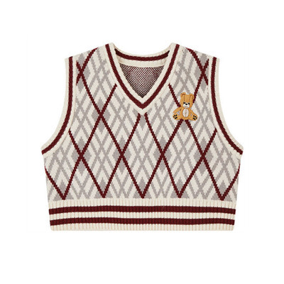 トップス ベスト ニット アーガイル 刺繍 くまちゃん レディース ショート丈 Vネック ノースリーブ オシャレ お洒落 きれいめ かわいい 大人可愛い ガーリー 10代 20代 30代 着回し 重ね着 シンプル カジュアル ラフ ジレ チョッキ ブルー ベージュ ブラウン 茶色 ライン 華奢 細見え タイト スリム 春 秋 冬 抜け感 レトロ アンティーク ヴィンテージ 柔らか 着心地 学生 スクール 制服 脚長 スタイルアップ チェック柄 ダイヤ シック モダン くすみカラー 熊 クマ テディベア
