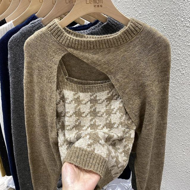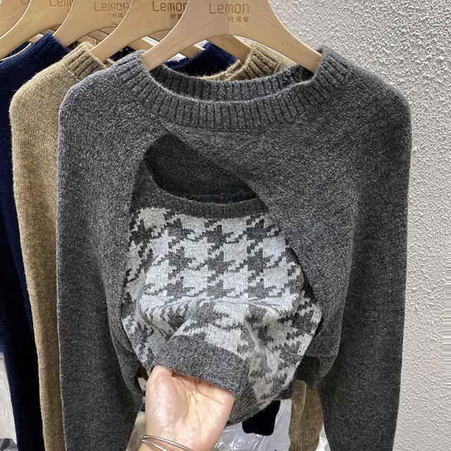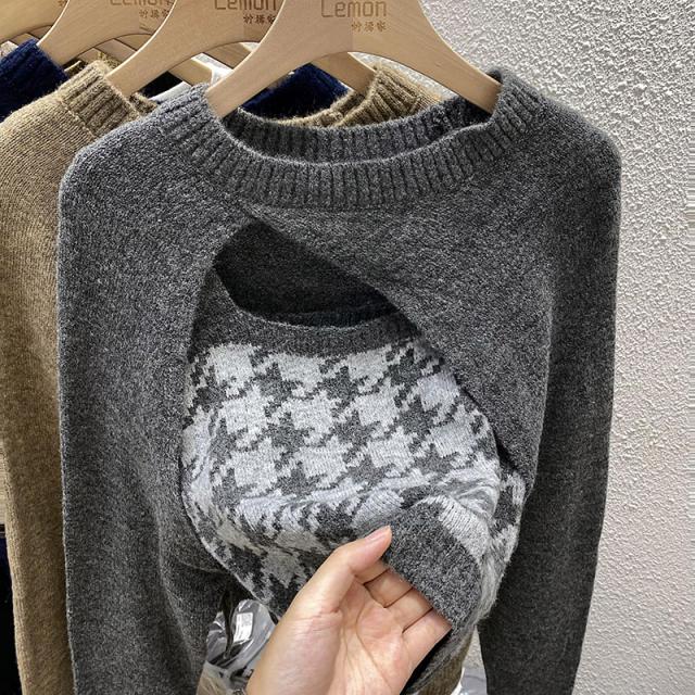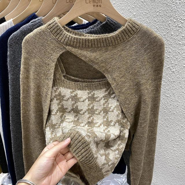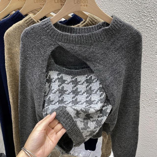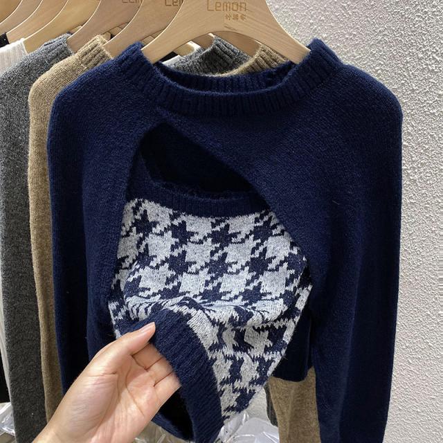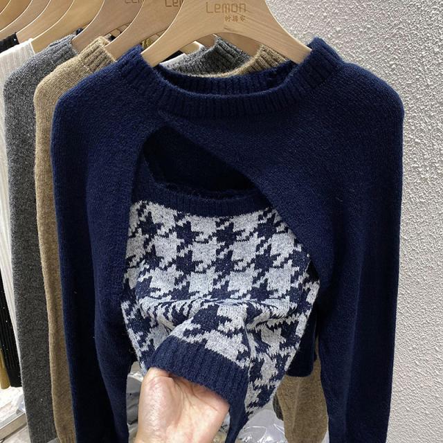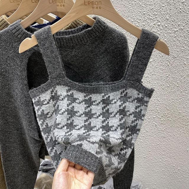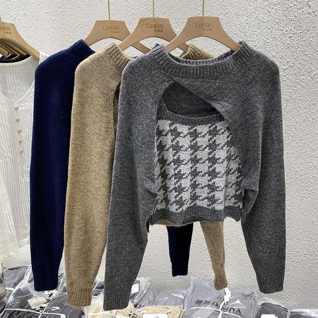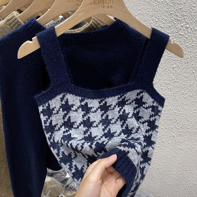 トップス 2点セット カーディガン キャミソール 3色 ニット レディース 千鳥格子 タイト スリム 長袖 きれいめ 上品 エレガント バイカラー ブラウン 茶色 ネイビー 紺 グレー 灰色 カジュアル 体型カバー 細見え 着痩せ 秋 冬 春 かわいい 大人可愛い オシャレ お洒落 デート モテ 女子会 ゆる こなれ感 ショッピング 10代 20代 30代 40代 前開き ルーズ ゆる 量産型 韓国 トレンド 流行 ラウンドネック 手触り 着心地 学生 お得 お買い得 ショート丈 脚長 スタイルアップ
