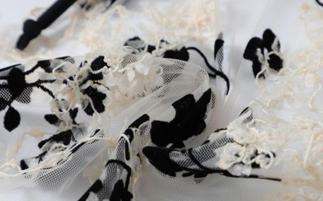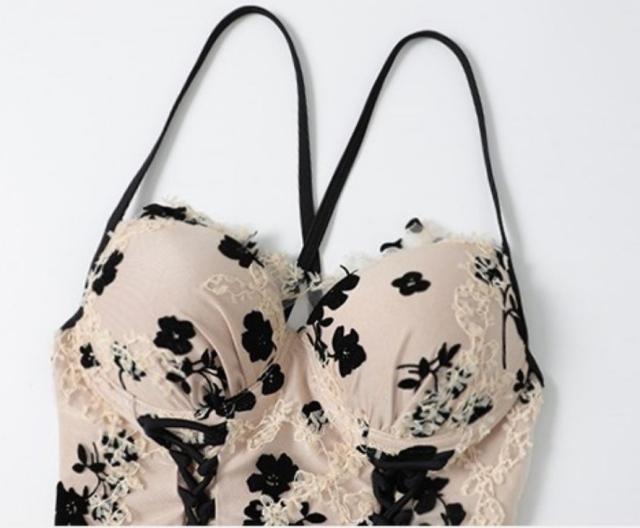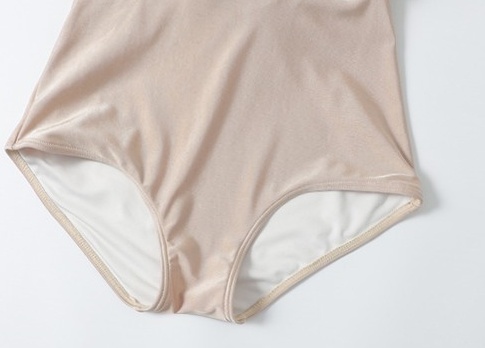 ベージュ地に黒の刺繍でラグジュアリーな雰囲気の水着です。