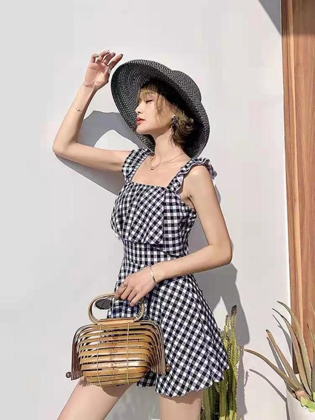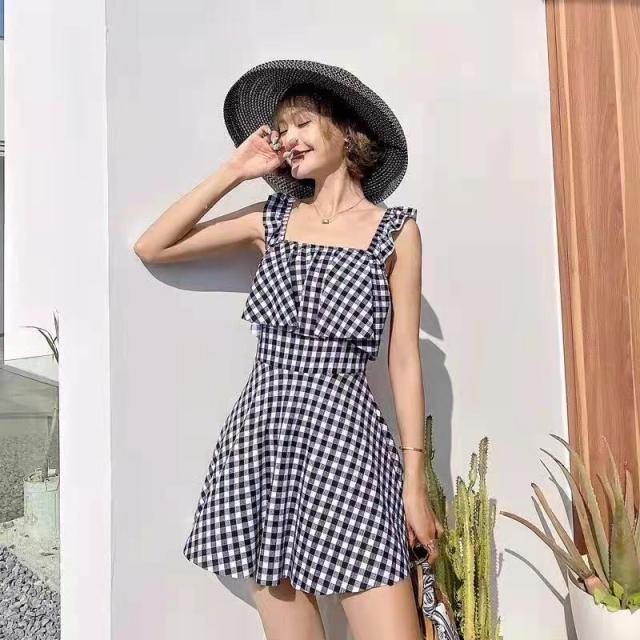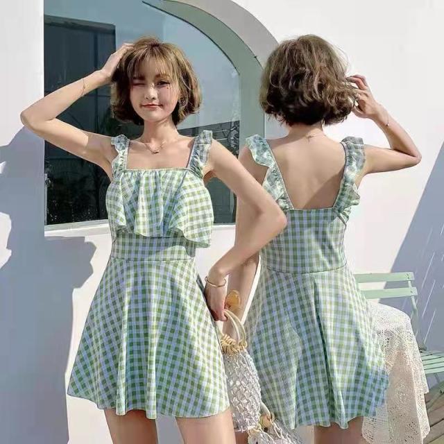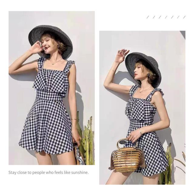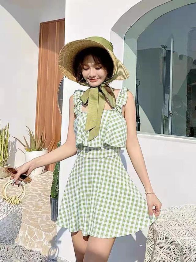 2色カラバリ、ギンガムチェック柄ワンピーススカート水着。