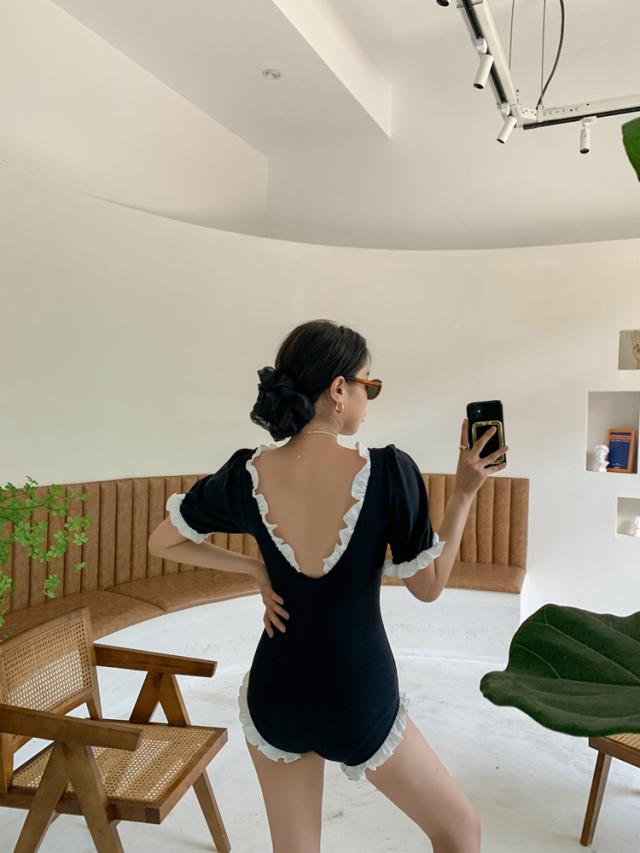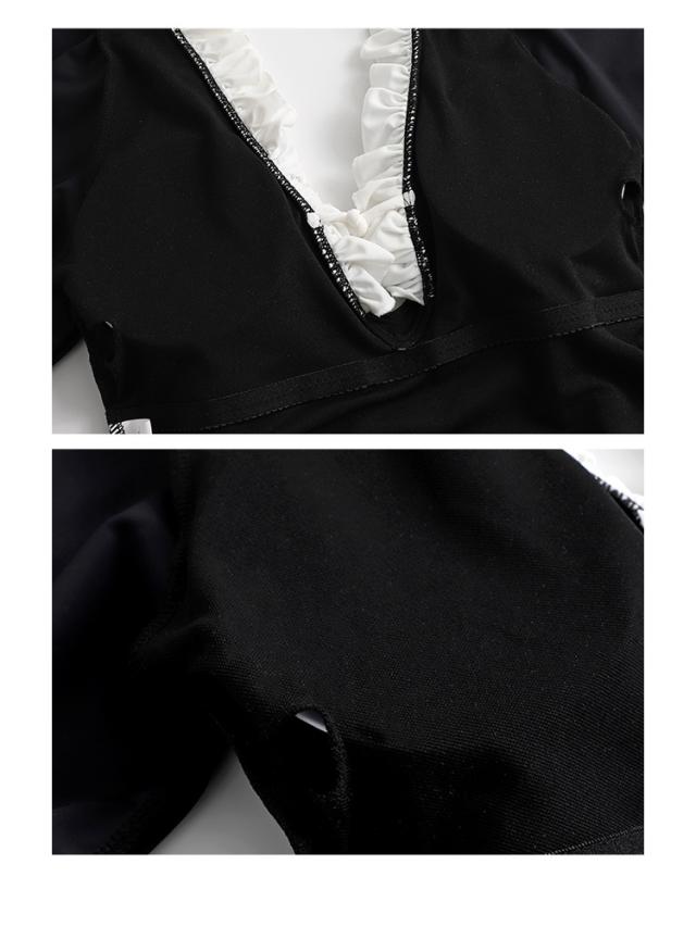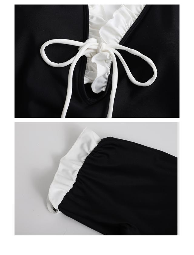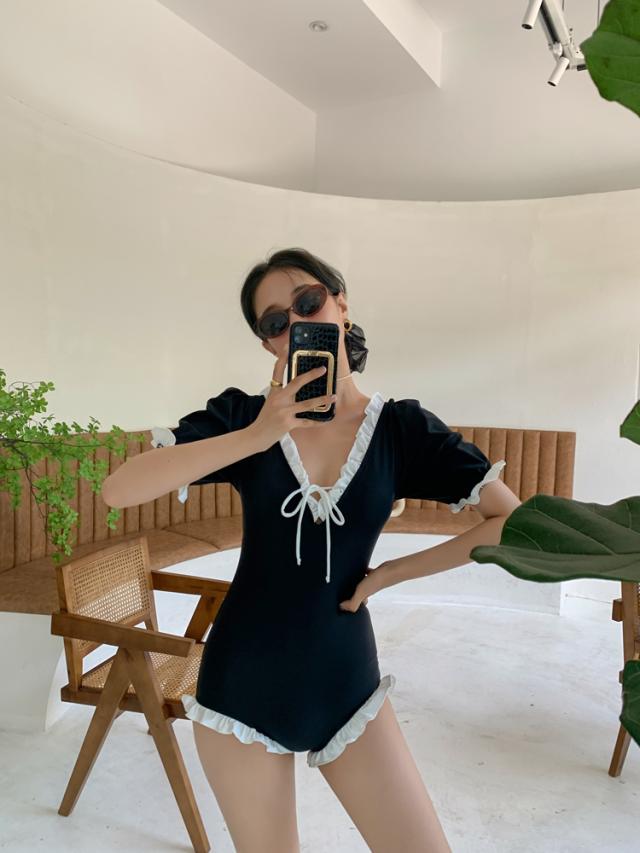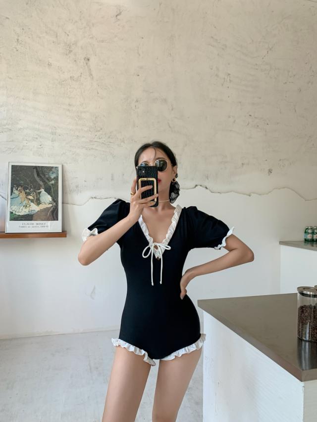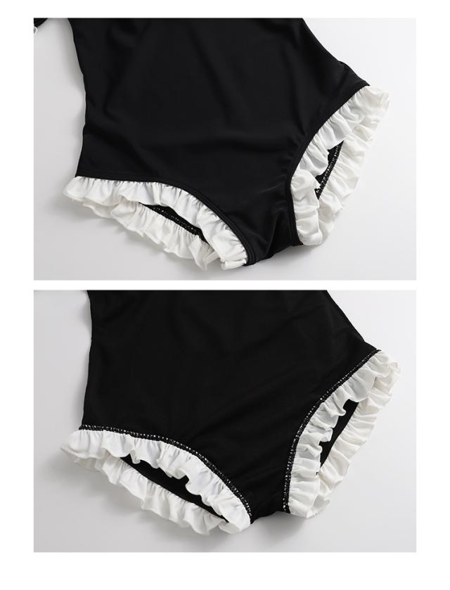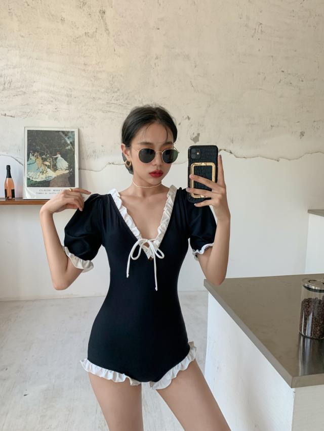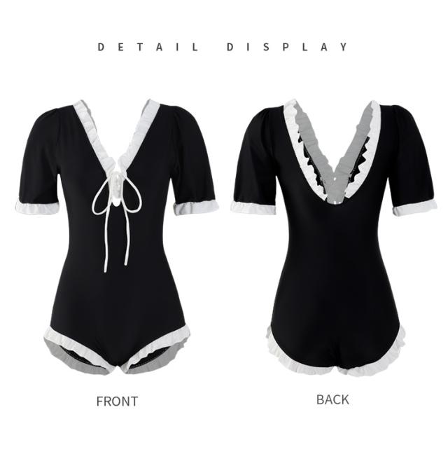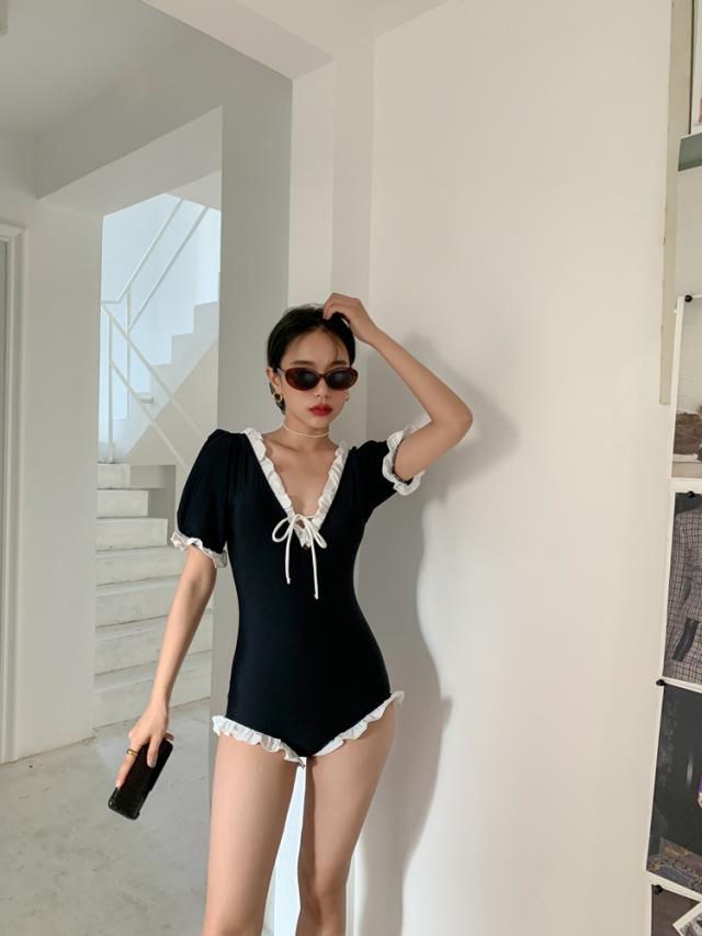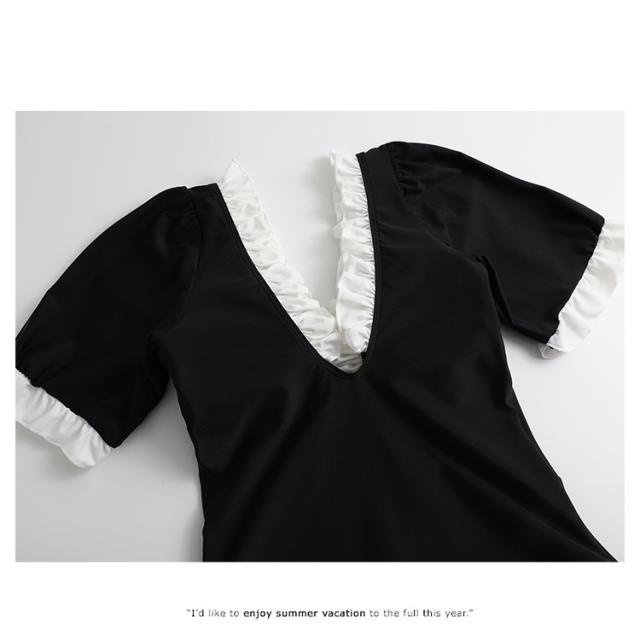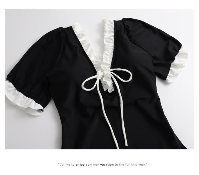 水着 スイムウエア レディース ワンピース水着 体型カバー水着 二の腕カバー 半袖 リボン フリル オールインワン レースアップ かわいい 大人可愛い きれいめ セクシー sexy ナチュラル おしゃれ お洒落 大人 大人っぽい 主役級 存在感 女っぽ レトロ 個性的 M L XL 黒