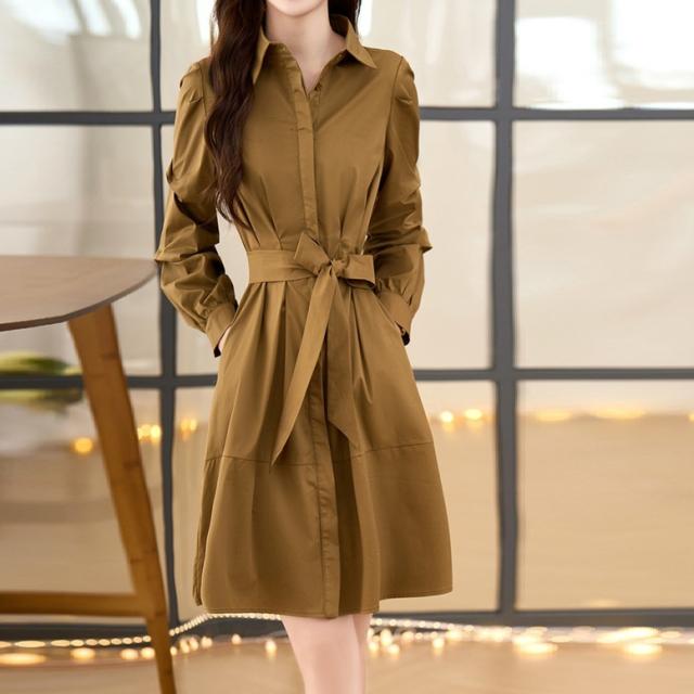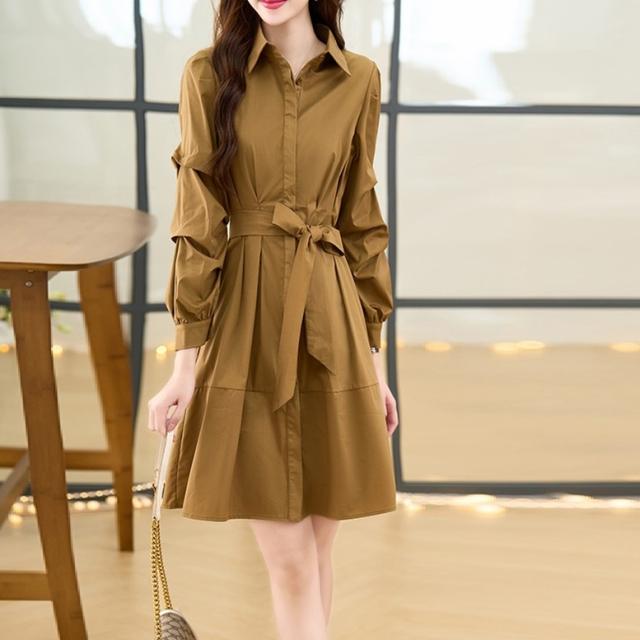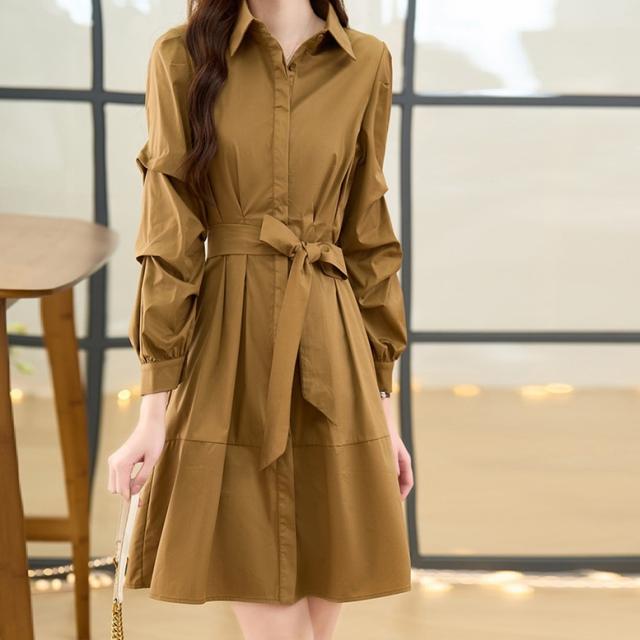 ワンピース ミディアムシャツワンピース レディース シャツワンピース ひざ上丈 ショート丈 ウエストリボン シャツドレス 襟付き 長袖 スリム 無地 フェミニン 茶色 ブラウン 大人可愛い きれいめ 上品 エレガント フォーマル ガーリー 大人女子 おしゃれ シンプル カジュアル