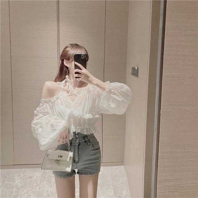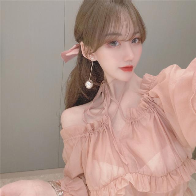 フリルシャーリングブラウス トップス レディース ブラウス シャツ フリル ボリュームスリーブ シフォンブラウス シアーブラウス 長袖 オフショルダー シースルー クロップドブラウス リボン 無地 ピンク ホワイト 白 大人可愛い きれいめ 上品 エレガント ガーリー ルーズ