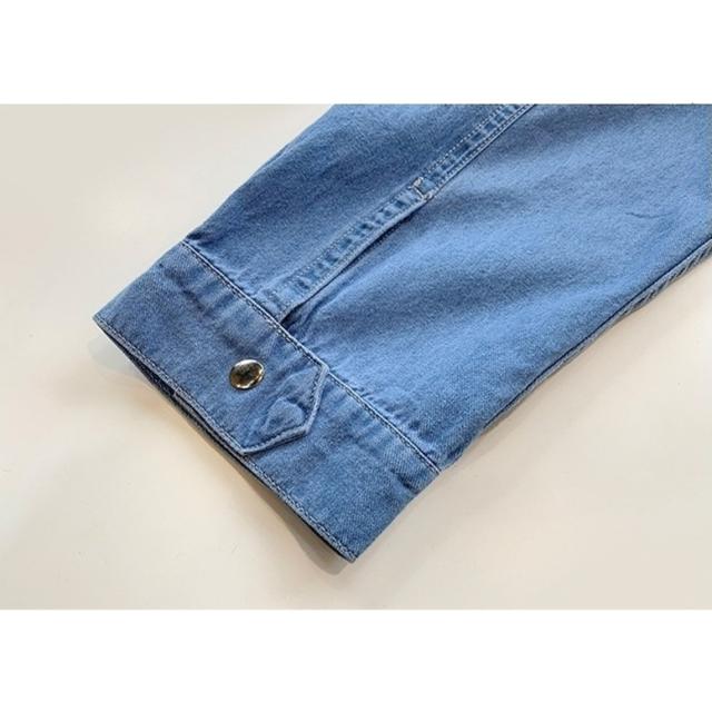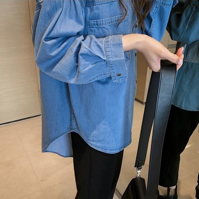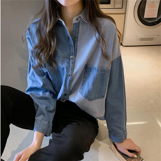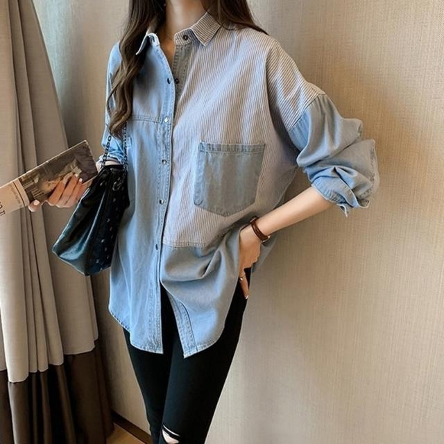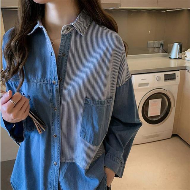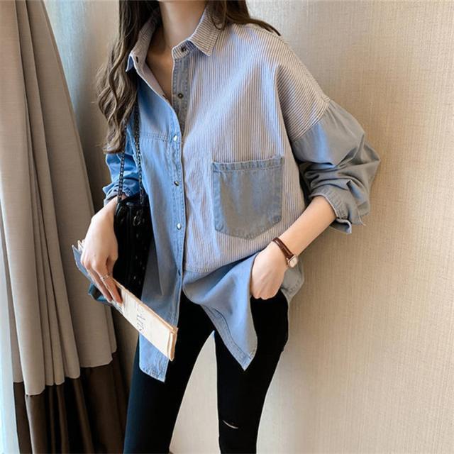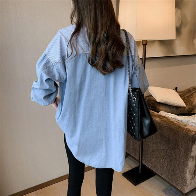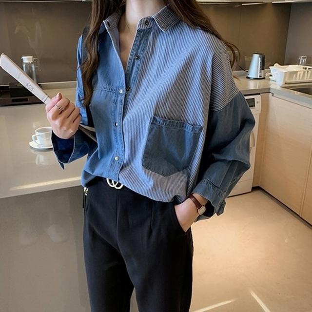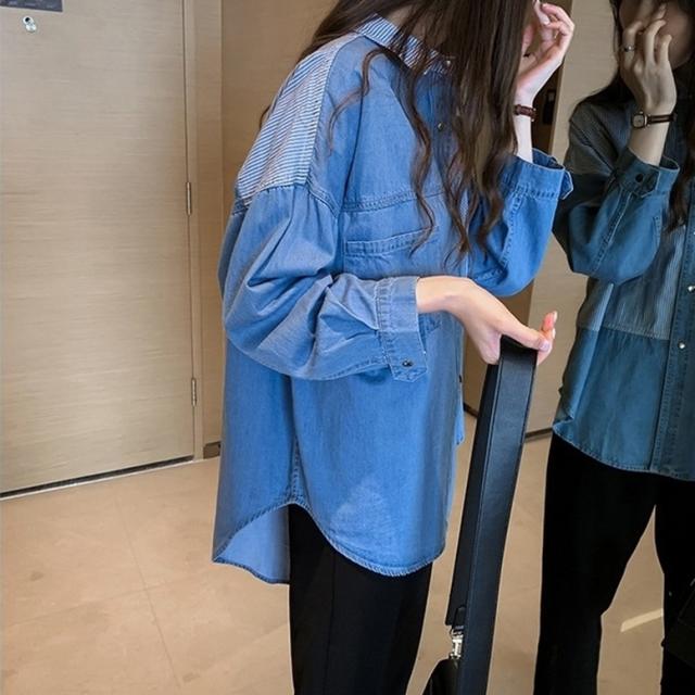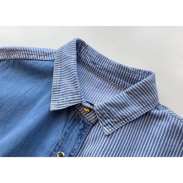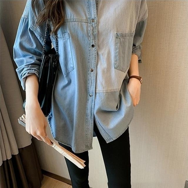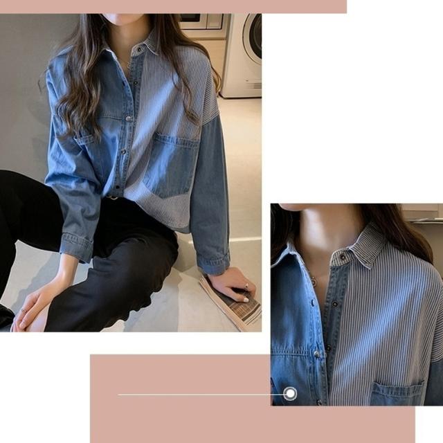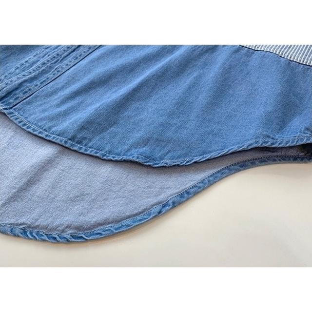 ストライプデニムシャツ トップス レディース シャツ デニムシャツ ストライプ 切り替え 襟付き 長袖 ドロップショルダー アシンメトリー 無地 ストライプ柄 オーバーシャツ デニム ブラウス 青 水色 ブルー ライトブルー 大人可愛い きれいめ 上品 ガーリー マニッシュ